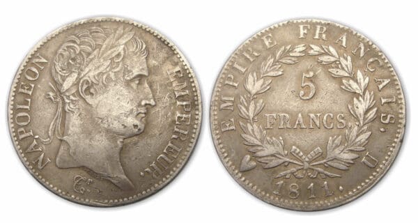 5 frs Napoléon revers Empire 1811 U (Turin)