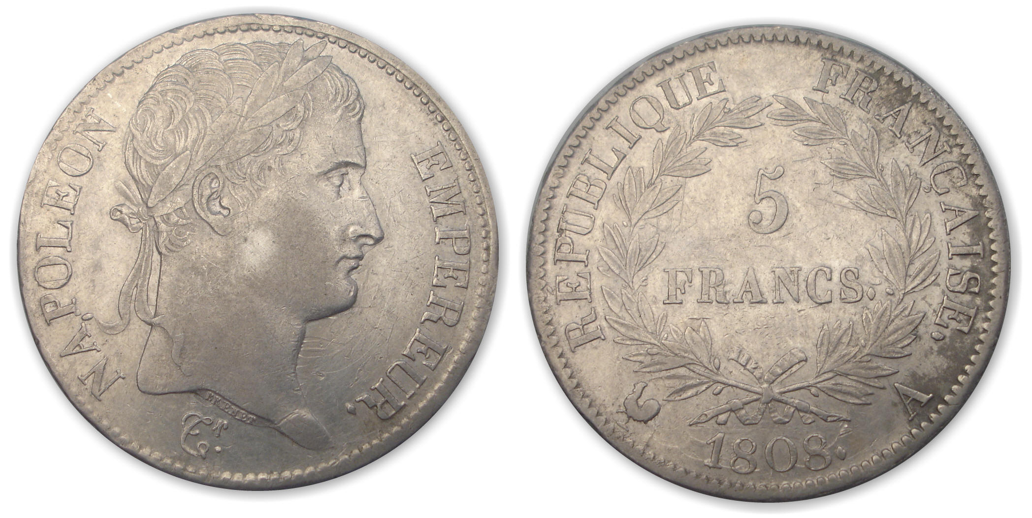 5 frs Napoléon revers Répulique 1808 A (Paris)