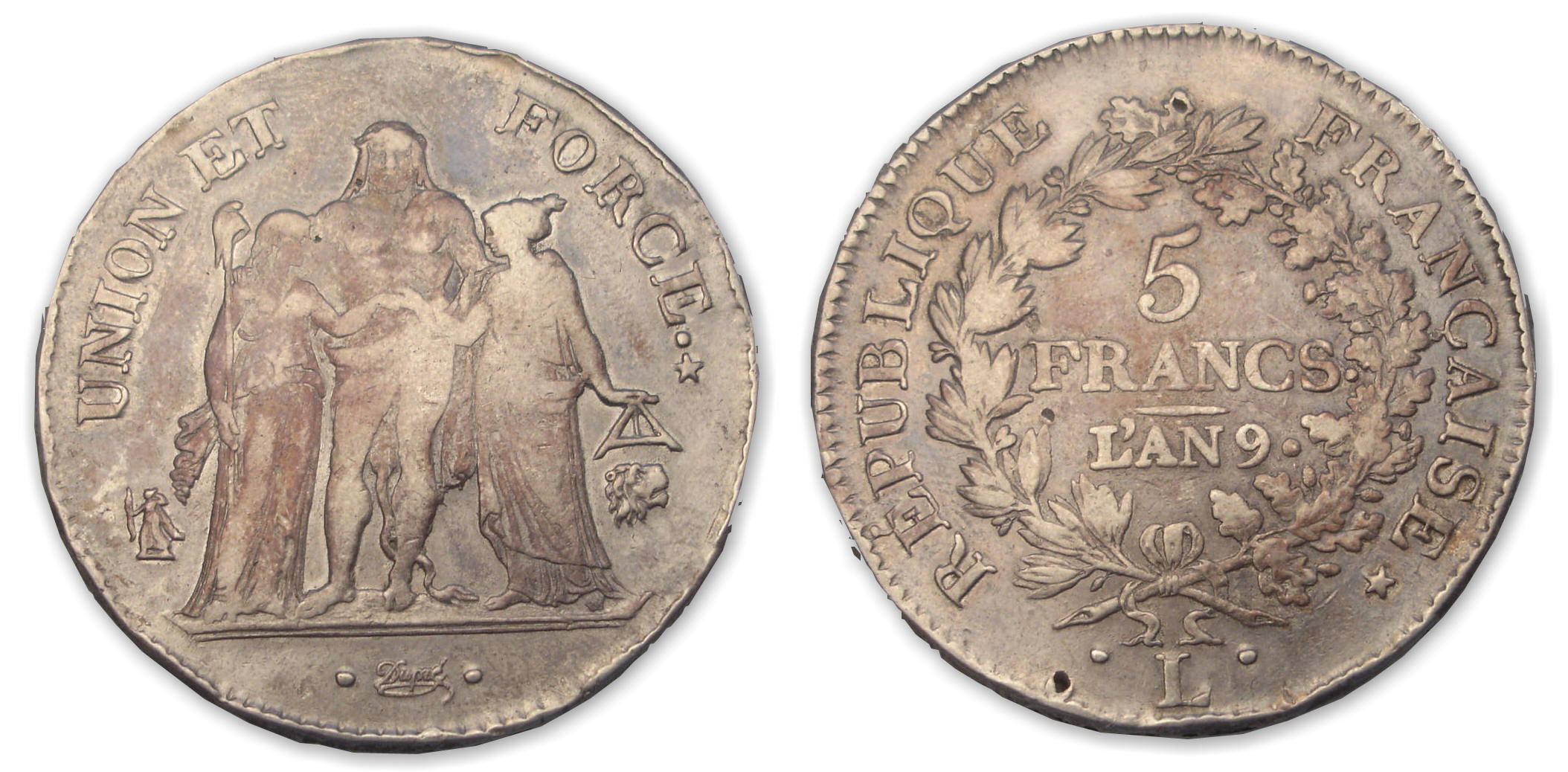 Avers : A/ UNION ET FORCE.. Hercule nu debout de face avec la léonté, unissant la Liberté debout à gauche tenant une pique surmontée d’un bonnet phrygien et l’Égalité debout à droite, tenant le niveau, à l’exergue signé Dupré cursif.