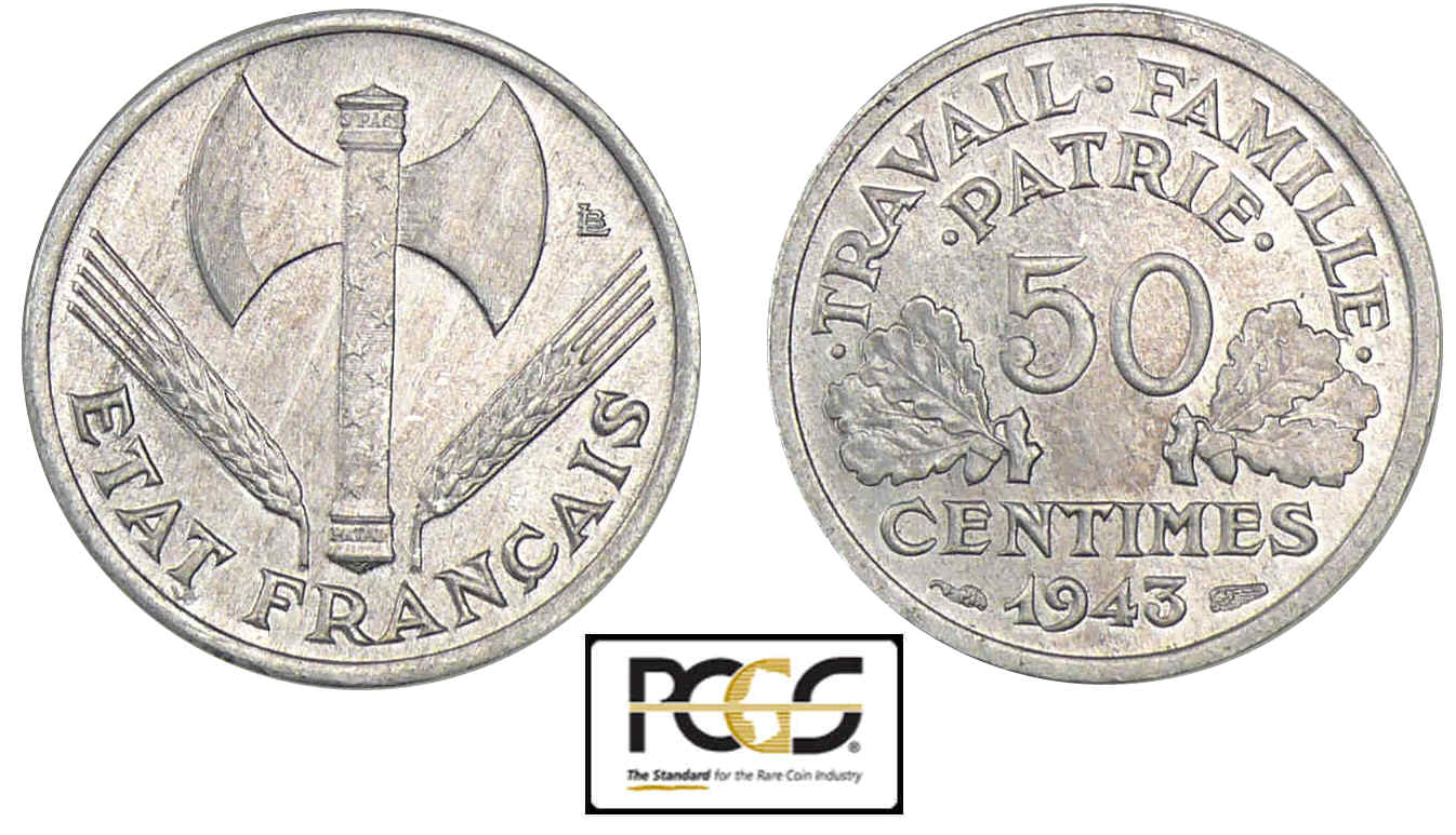 Revers : R/ TRAVAIL. FAMILLE. / .PATRIE. 50 / .CENTIMES. / 1943 entre deux branches de chêne portant chacune un gland et cinq feuilles.