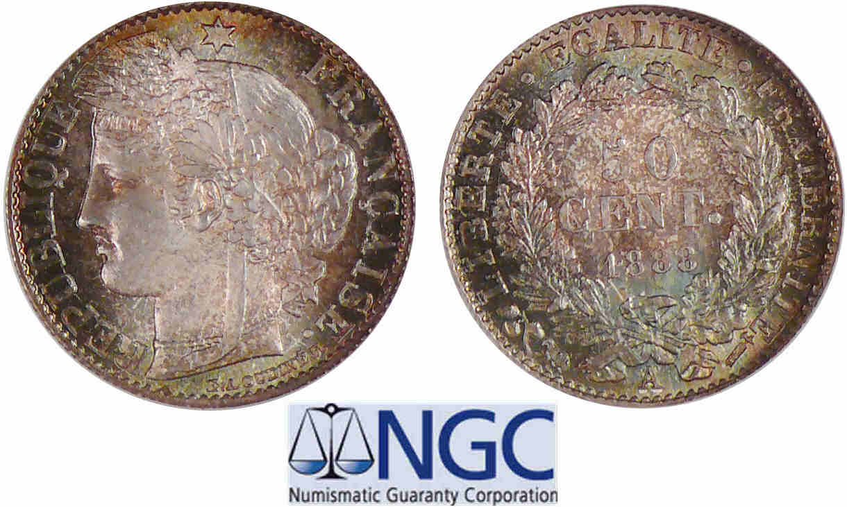 Revers : R/ LIBERTE. EGALITE. FRATERNITE.// 50 / CENT. / dans une couronne formée d’une branche de laurier à gauche et d’une branche d’olivier à droite.