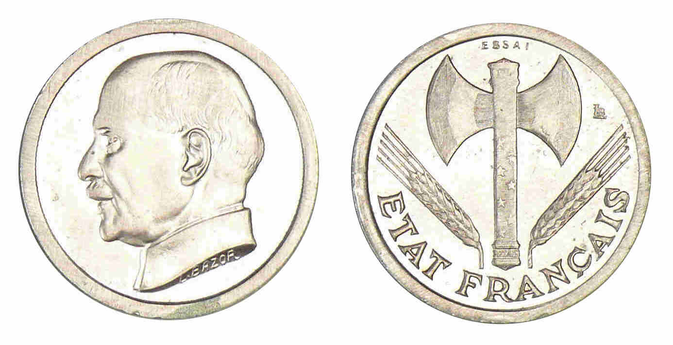 R/ ETAT FRANÇAIS. Francisque dont le manche est formé par un bâton de maréchal, orné de dix étoiles à cinq rais.