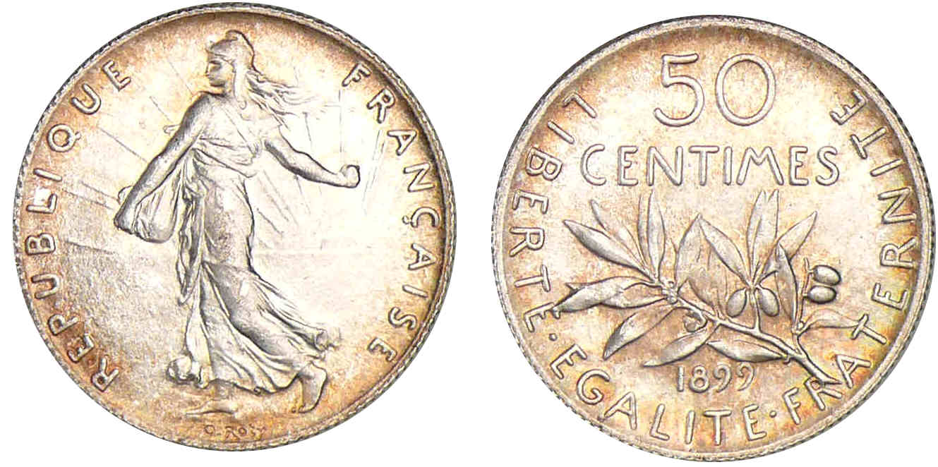 Revers : R/.LIBERTE. EGALITE. FRATERNITE. 50 / CENTIMES au-dessus d’une branche d’olivier. Millésime à l’exergue.