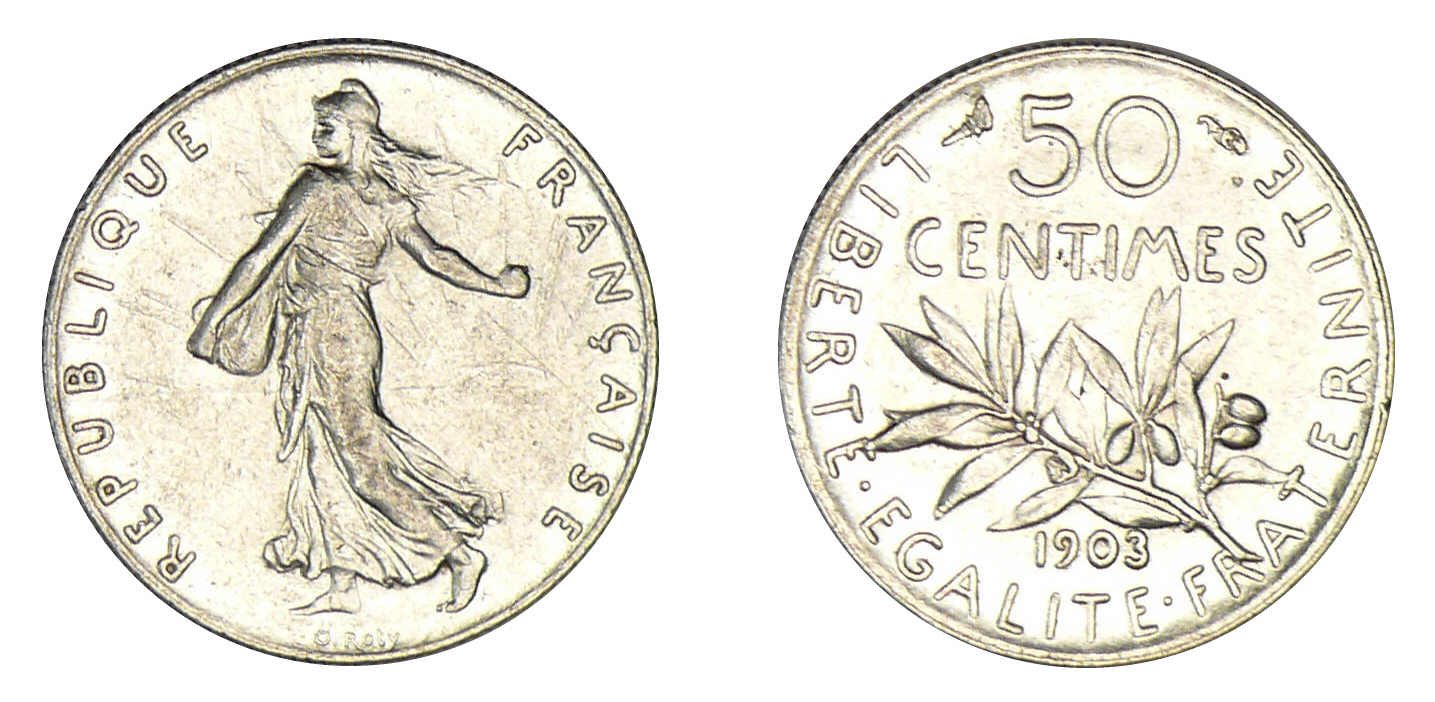 R/LIBERTE. EGALITE. FRATERNITE. 50 / CENTIMES au-dessus d’une branche d’olivier, à l’exergue (millésime).