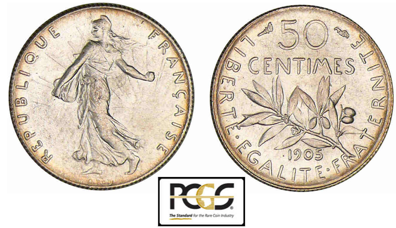 Revers : R/.LIBERTE. EGALITE. FRATERNITE. 50 / CENTIMES au-dessus d’une branche d’olivier. Millésime à l’exergue.