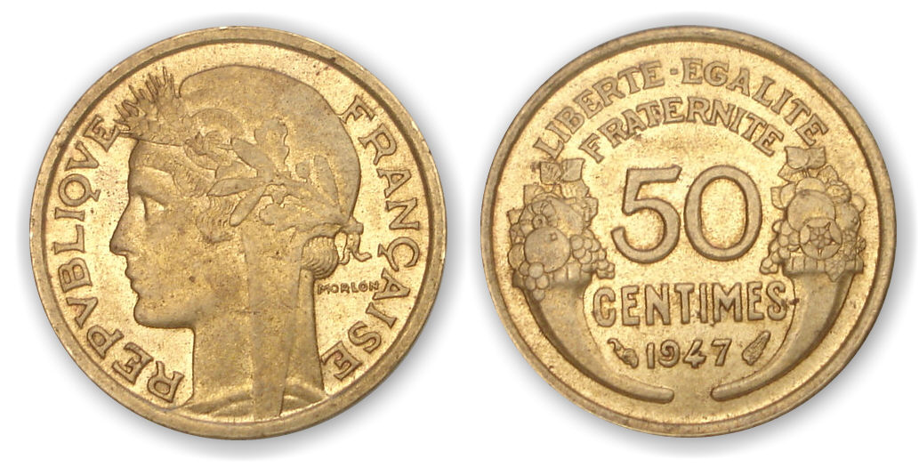 Revers : R/ LIBERTE – EGALITE / FRATERNITE 50 / CENTIMES / (millésime) entre deux cornes d’abondance.