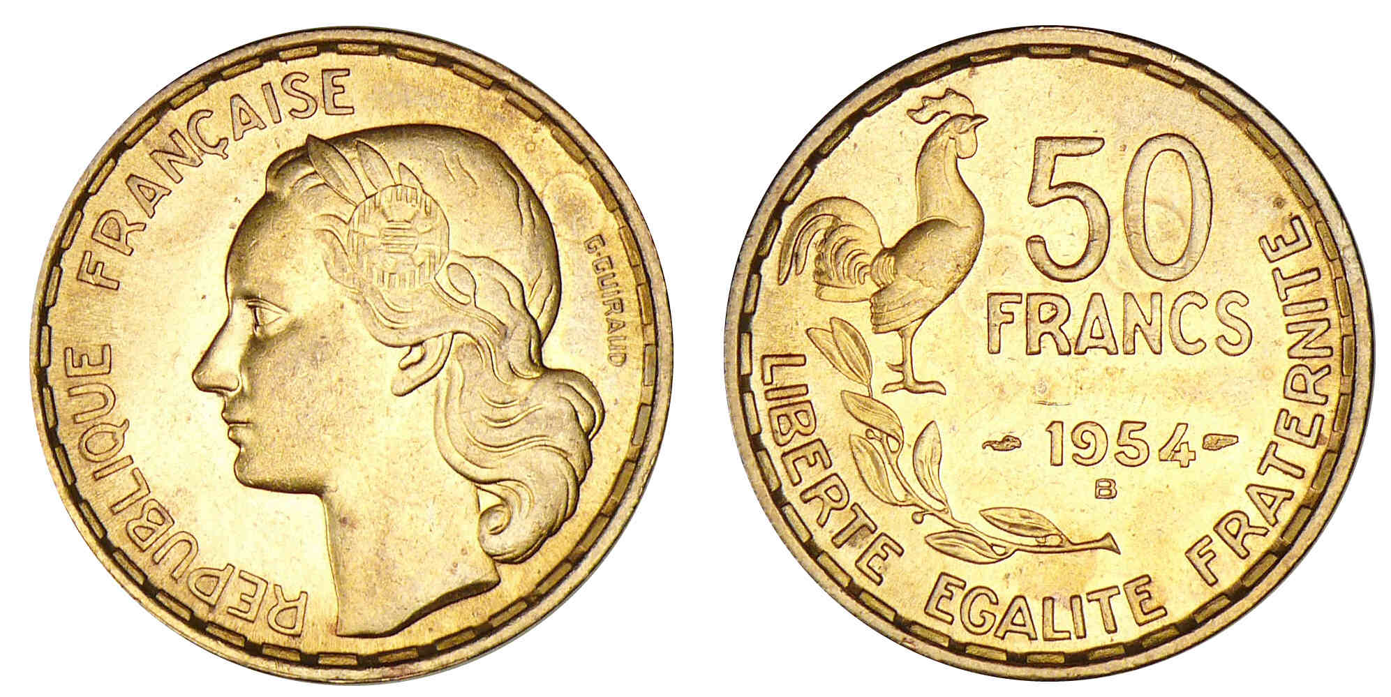 Revers : R/ LIBERTE – EGALITE – FRATERNITE. 50 / FRANCS / (millésime). Coq debout à droite au-dessus d’une branche d’olivier.