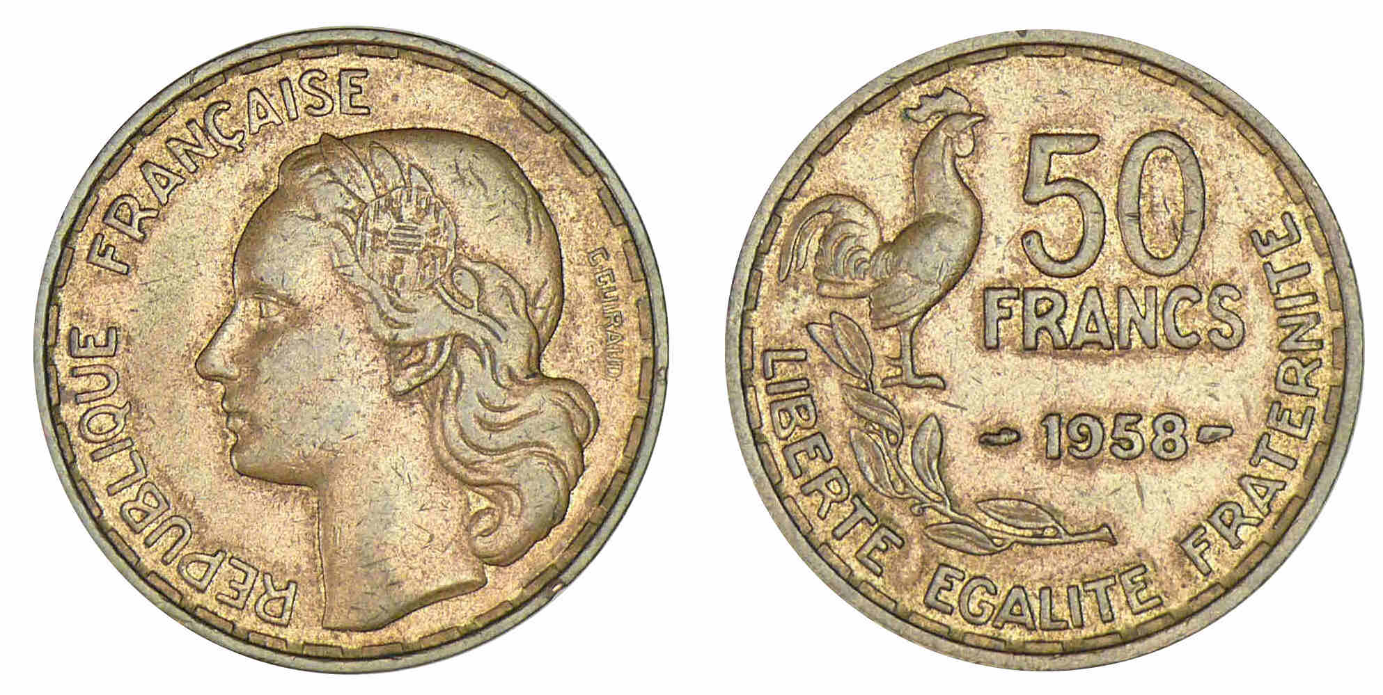 R/ LIBERTE – EGALITE – FRATERNITE. 50 / FRANCS / (millésime). Coq debout à droite au-dessus d’une branche d’olivier.