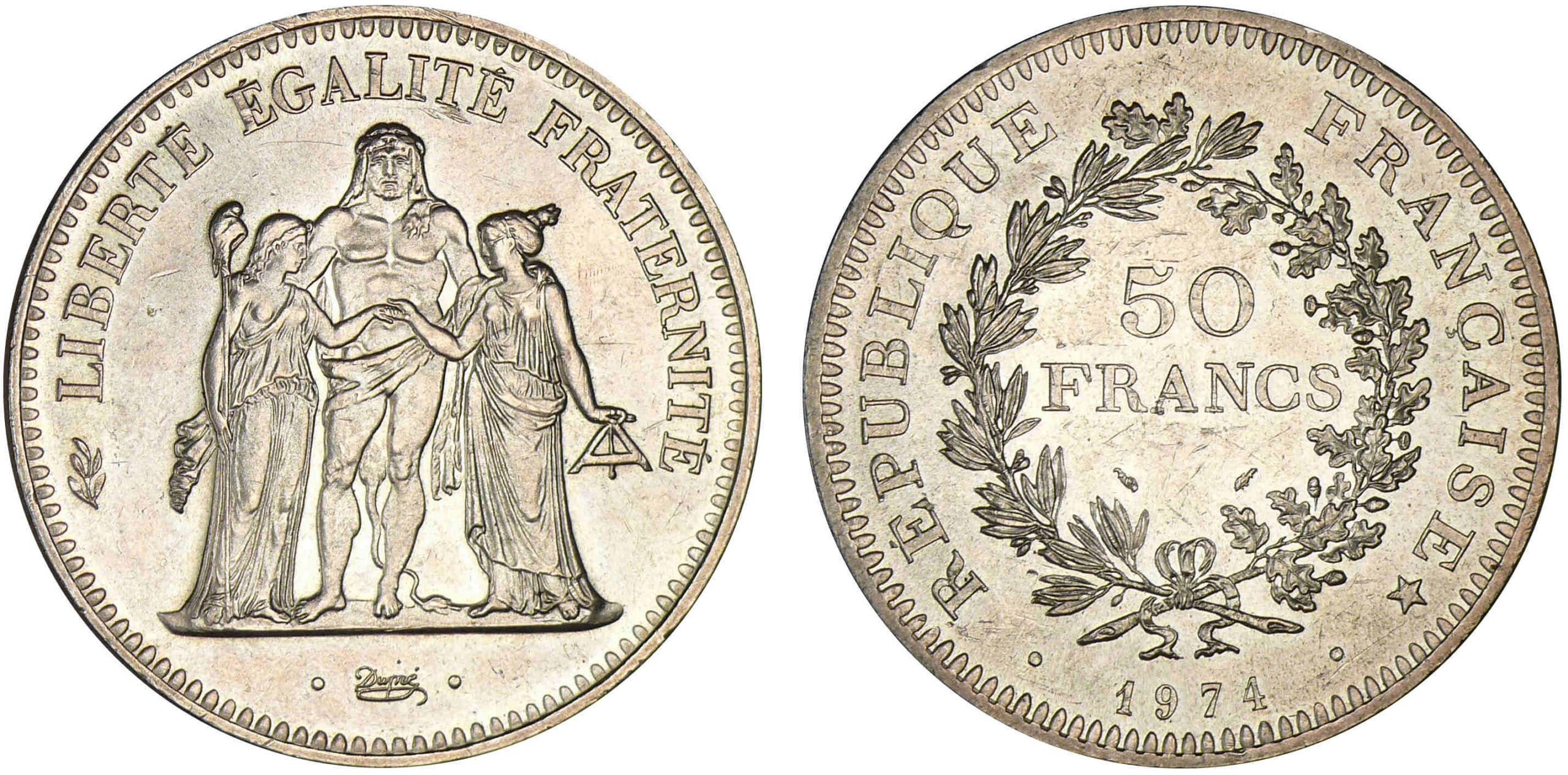 Revers : R/ REPUBLIQUE – FRANÇAISE // 50 / FRANCS / (millésime) // (atelier) dans une couronne formée d’une branche d’olivier et d’une branche de chêne.