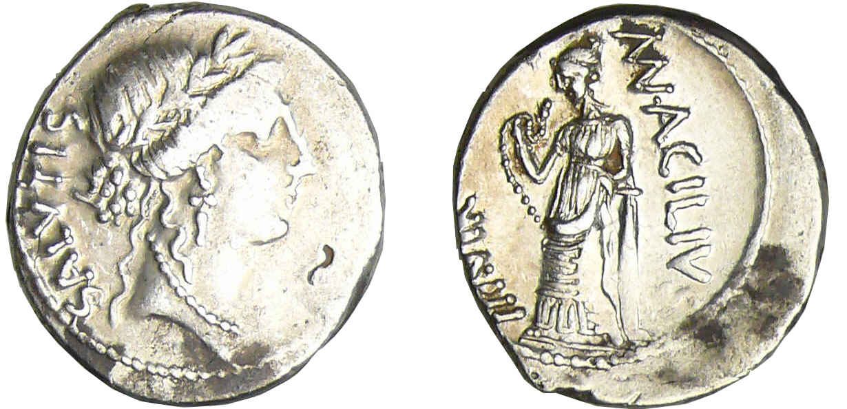 R/ MN.ACILIVS / III.VIR.VALETV. La Santé debout à gauche, appuyée à une colonne et tenant un serpent.