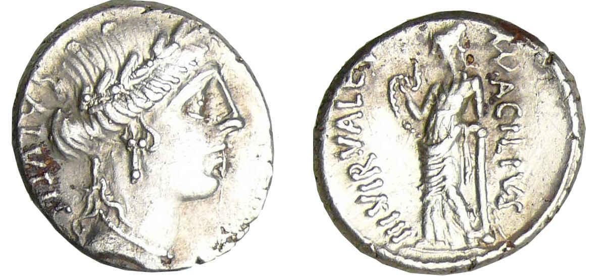 R/ MN.ACILIVS / III.VIR.VALETV. La Santé debout à gauche, appuyée à une colonne et tenant un serpent.