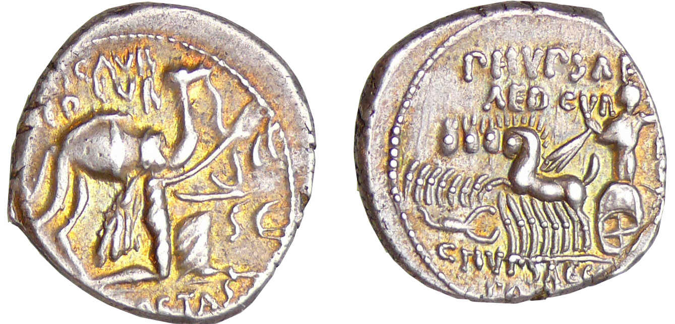Revers : R/ P HVPSEA // AED CVR // C HVPSAE COS PREIVE // CAPTV. Jupiter dans un quadrige à gauche, brandissant la foudre et tenant les rênes. Un scorpion sous les chevaux.