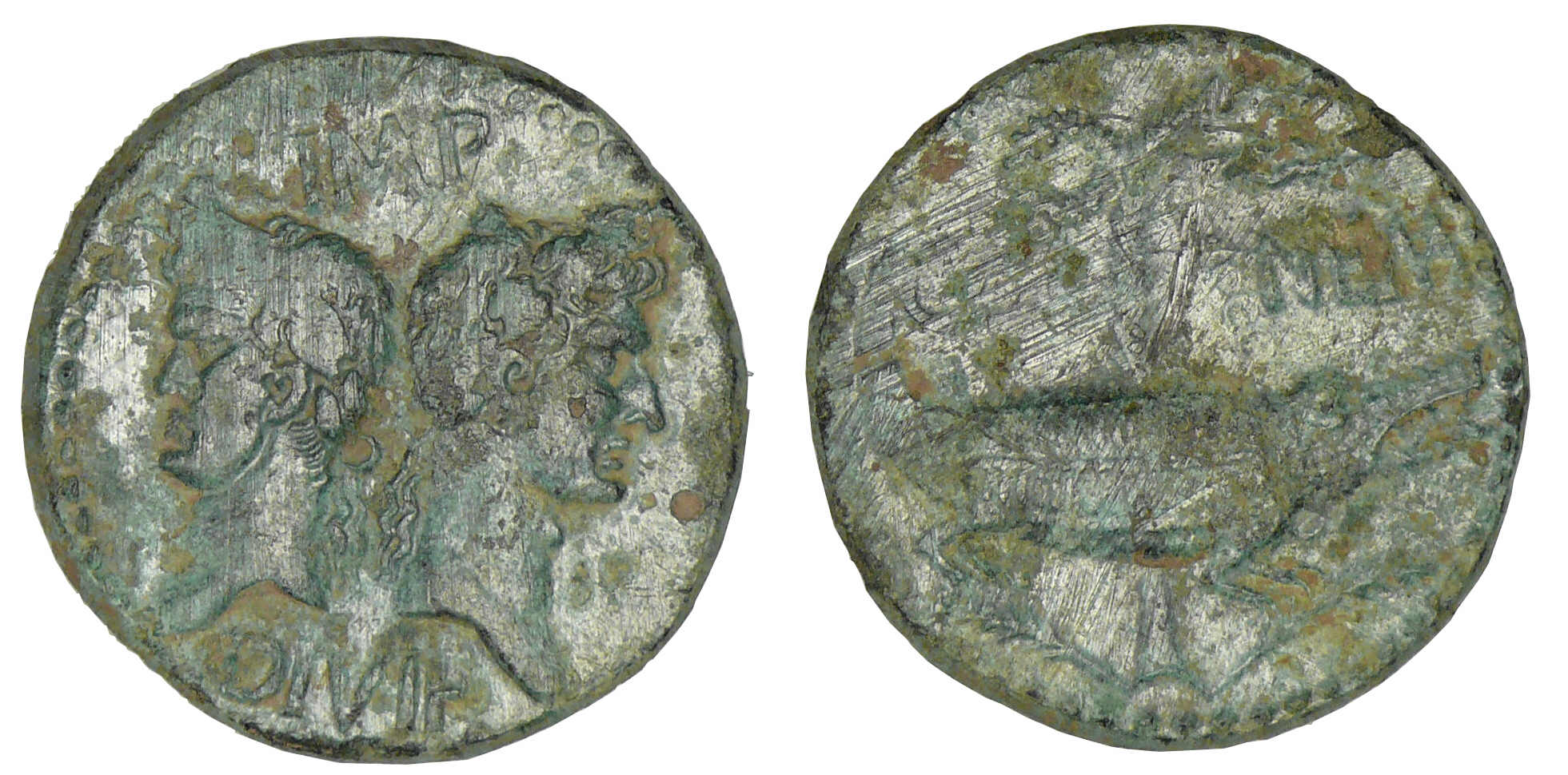 A/ IMP DIVI F. Têtes adossées d’Auguste tête nue et d’Agrippa avec la couronne rostrale.
