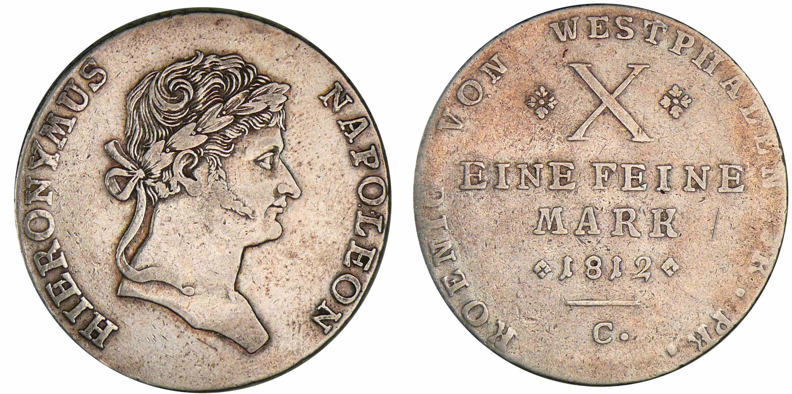 R/ Au centre :vXv EINE FEINE MARK v(millésime)v. Légende circulaire : KOENIG VON WESTPHALEN FR. PR.