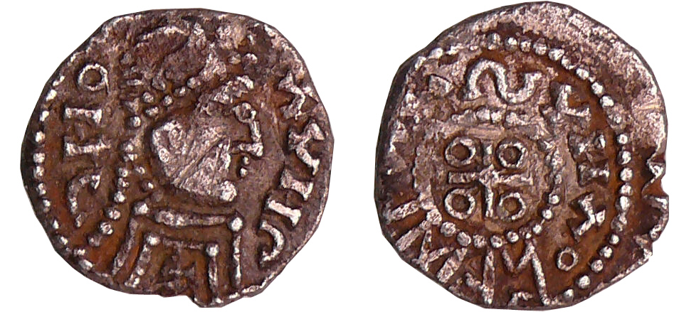 R/ Croix cantonnée de quatre annelets. Légende dégénérée ΛVSVNΛ incluant Pada en caratères runiques.
