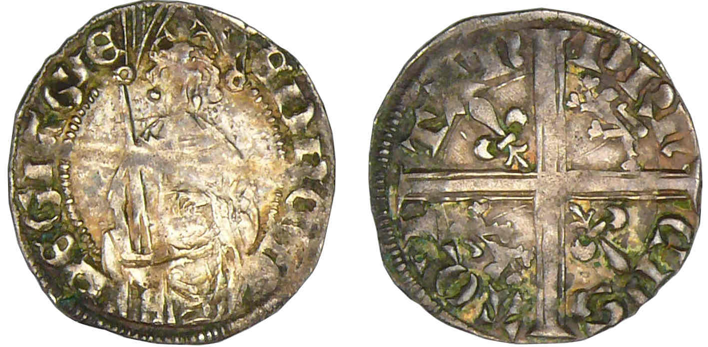 Avers : Edouard le Prince Noir (1362-1372). A/ + ED PO GNS REGI ANGLIE R. Croix cantonnée de deux lis et de deux léopards.