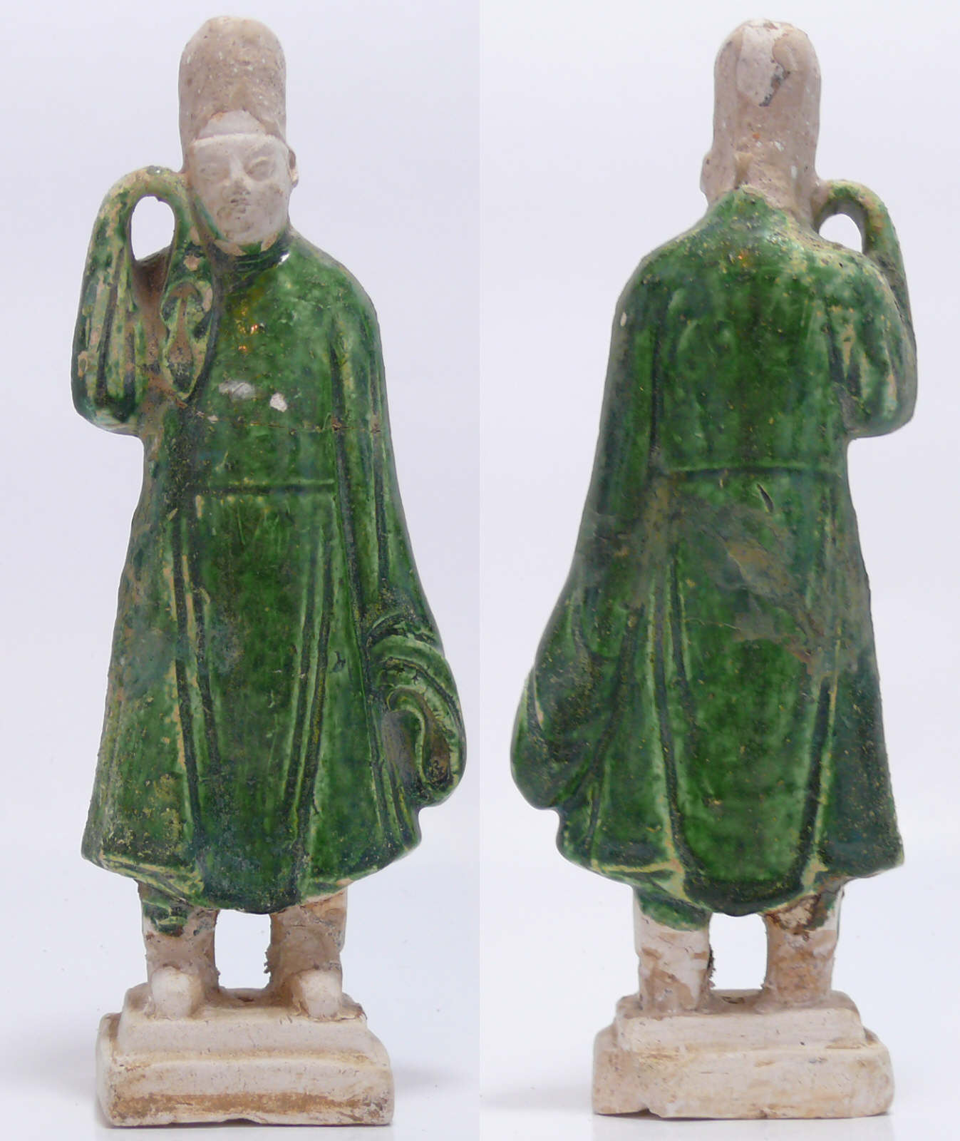 Avers : Très beau serviteur en terre cuite avec une très belle glaçure verte. Le personnage est debout et porte un grand vêtement dont les manches lui recouvrent les mains. L’un des bras est plié et la manche retombe sur sa poitrine. Traces de restauration sur la tête et recollage sur la poitrine. Dimension : 190 mm.