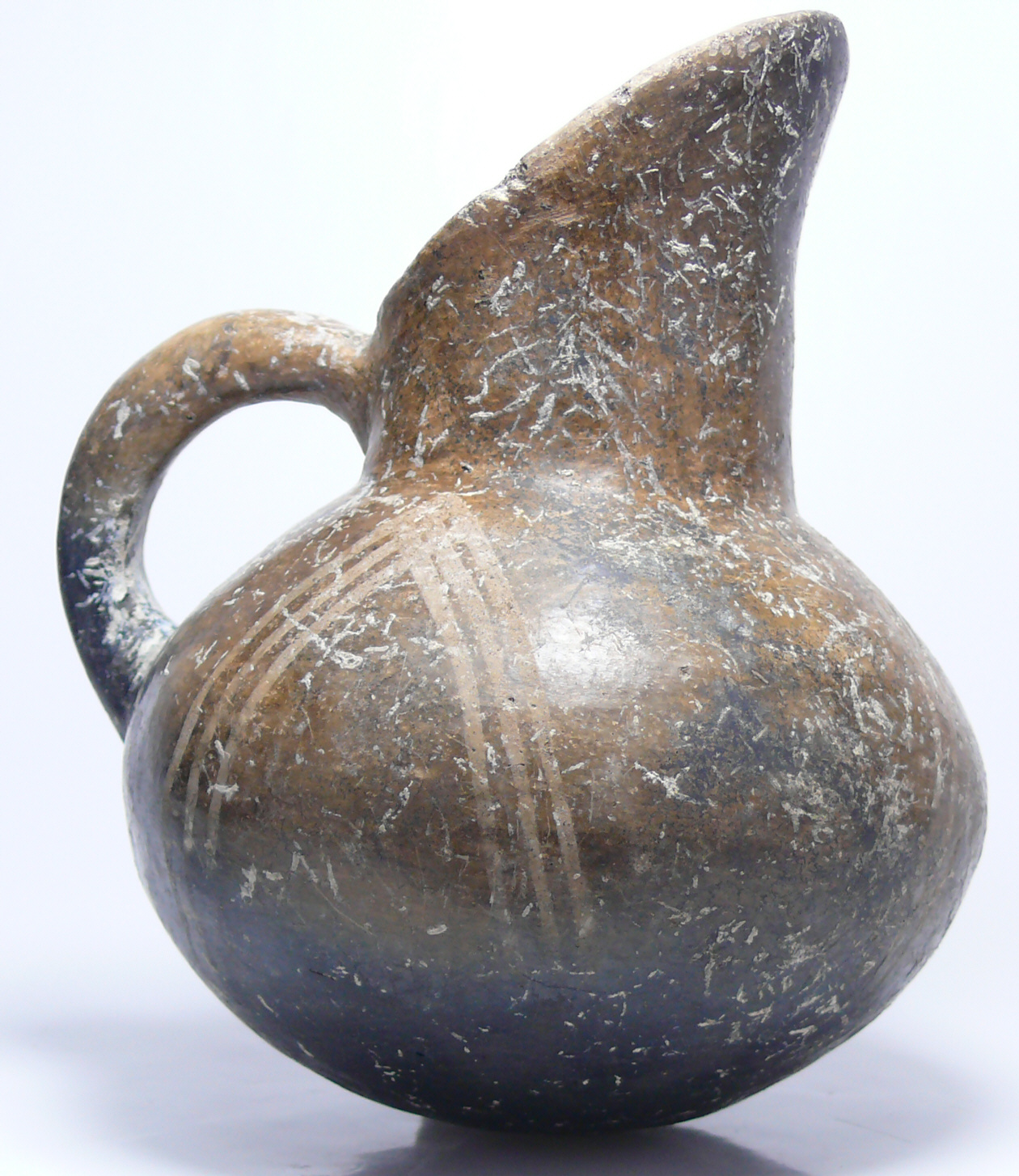 Avers : Important pot à bec verseur de la période Yortan avec une engobe brune orné de 3 séries de grands chevrons. Pas de traces de restauration. Une brillante civilisation européenne qui correspond aux trois derniers millénaires av. J-C, se développe sur les rives de la mer Egée. Hissarlik en Troade, la nécropole de Yortan, les îles de Santorin (ancienne Théra), de Chypre, de Rhodes, la Crète, ont fourni des monuments nombreux qui peuvent être considérés comme les premiers essais de la céramique occidentale. 155 mm de hauteur.