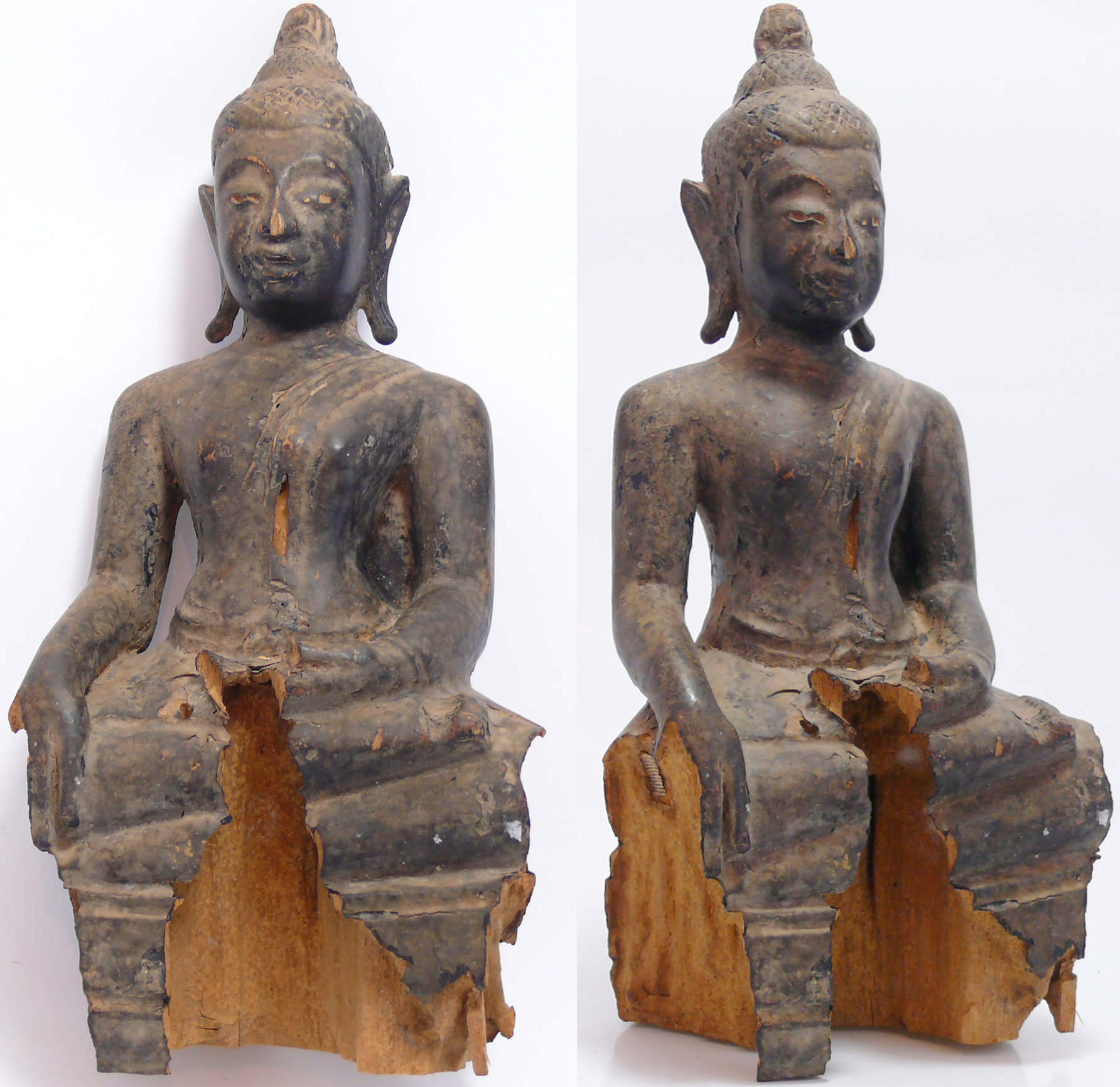 Avers : Important Boudha en bois sculpté laqué noir avec traces de dorure. Boudha est assis en position de méditation. Manques sur la partie basse de la sculpture. Dimension : 250 mm.