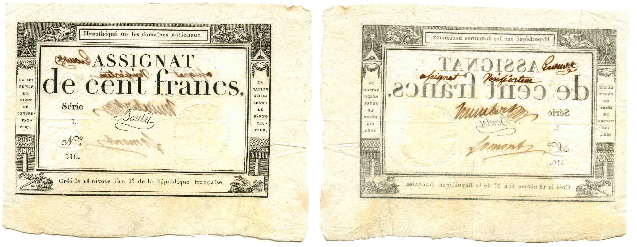 / Assignat vérificateur de 100 francs – Signé Bouly – 18 nivôse, An III (7 janvier 1795)