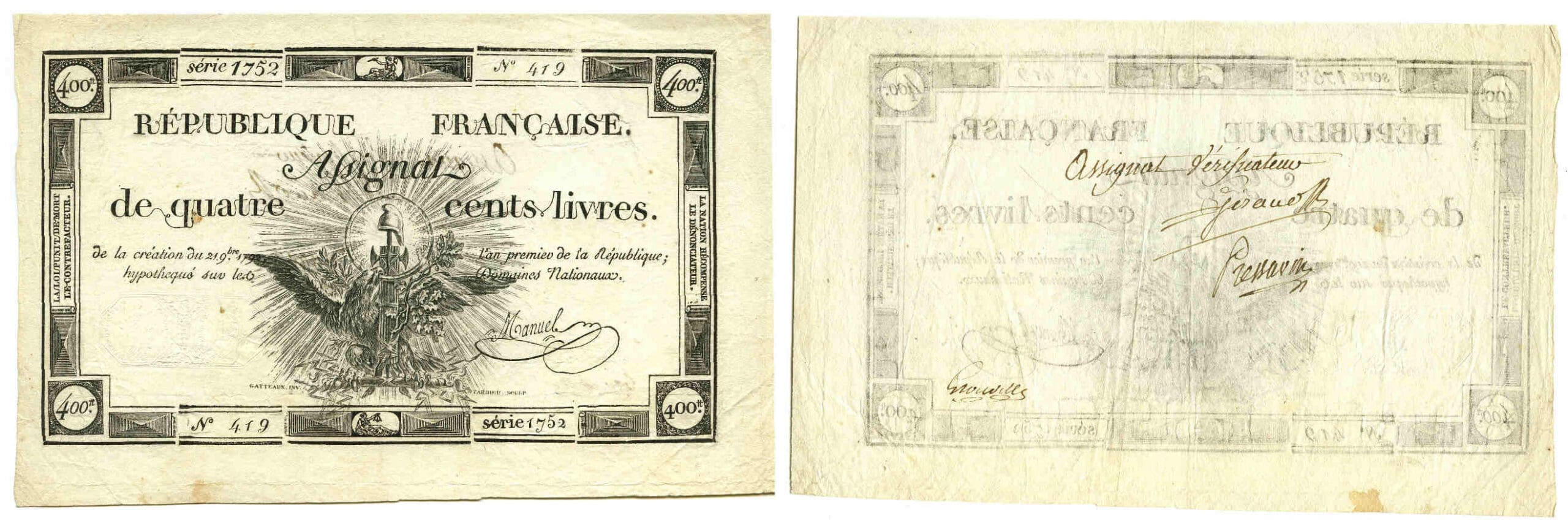 / Assignat vérificateur de 400 livres – Signé Manuel – 21 novembre 1792