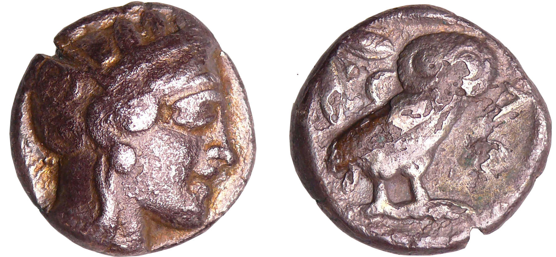 R/ ΑΘΕ. Chouette debout à droite, la tête de face. Le tout dans les restes d’un carré creux.