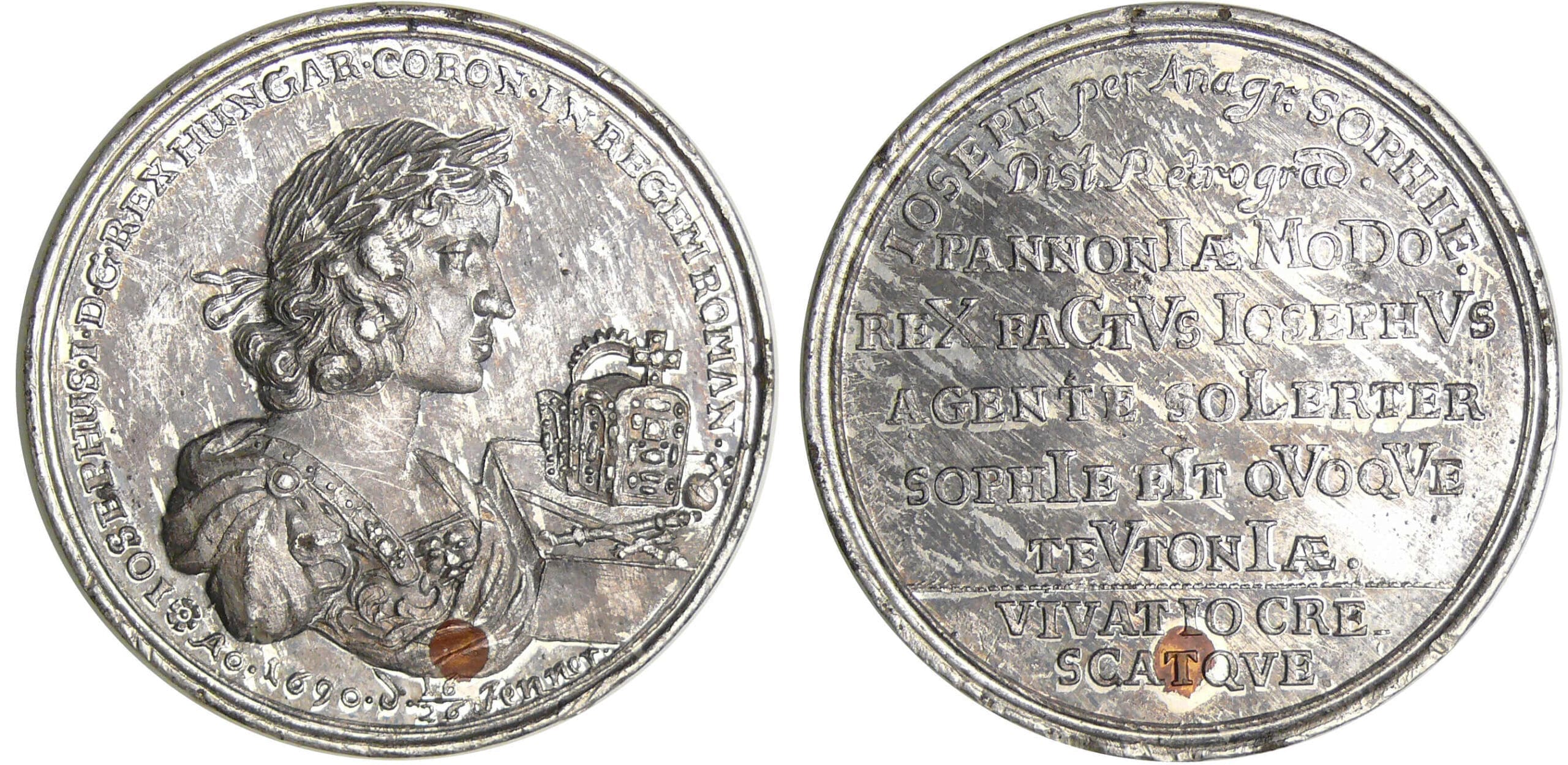 Essai de métal (bronze) au niveau du buste. Chronogramme (I M D X C V I V L I I V V V I) = 1684.