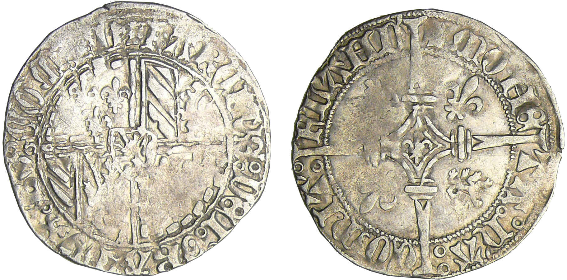 Avers : Charles Le Téméraire (1467-1477). A/ + KAROLVS: DEI: GRA:° DVX:° BG’: COm: FL, ponctuation par annelets superposés. Armes de Bourgogne à sept quartiers en plein champ.