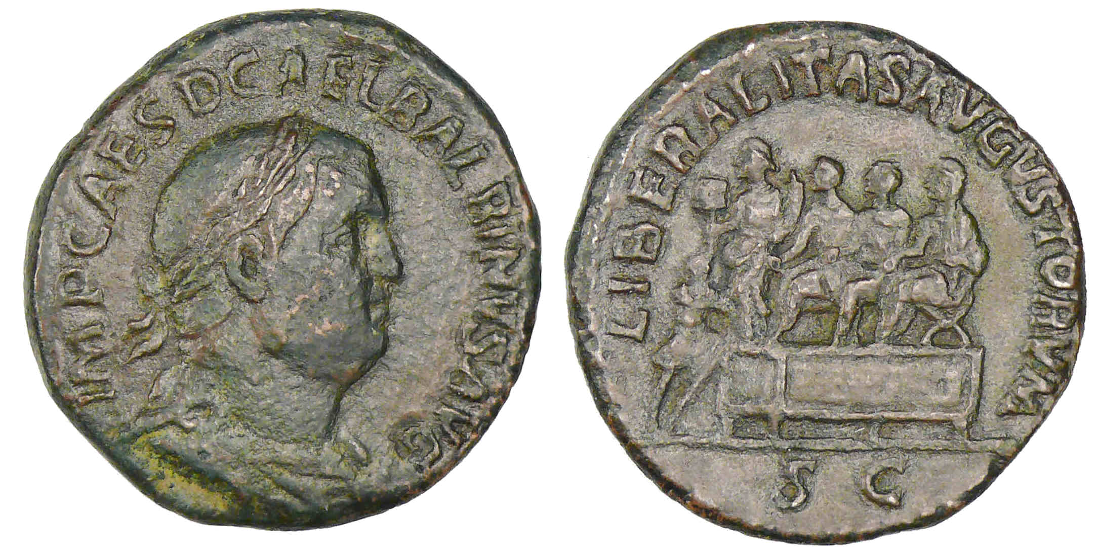 R/ LIBERALITAS AVGVSTORVM // SC. Balbin, Pupien et Gordien III assis à gauche sur une estrade.