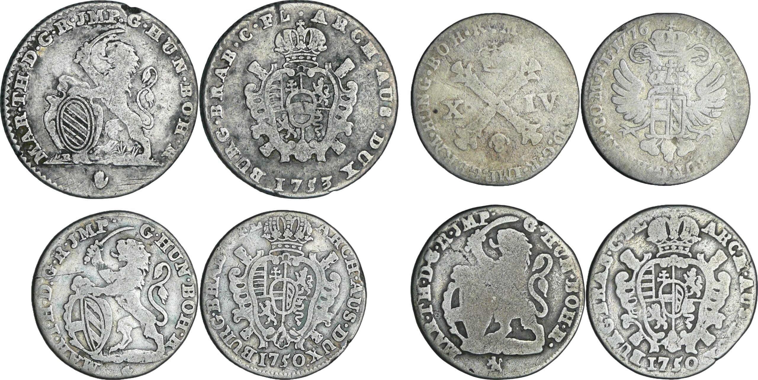Double escalin 1753 (Anvers) ; Escalin 1750 (Anvers) ; Escalin 1750 (Bruges) ; 14 liards 1776 (Bruxelles)