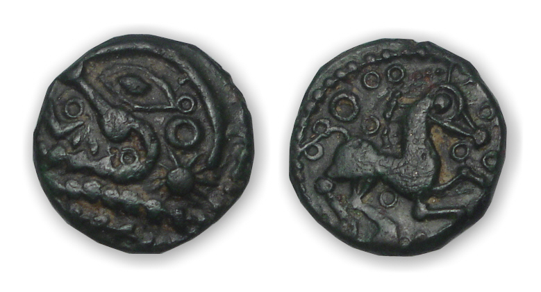 Revers : R/ Anépigraphe. Cheval libre galopant à droite, le cheval est accosté de plusieurs annelets, au-dessus du cheval, quatre annelets posés en carré avec un gros annelet central.