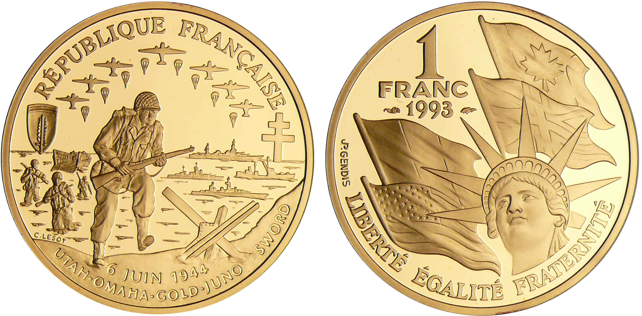 Cinquième république (1959- ) – 50ème anniversaire du débarquement – 1 franc Débarquement 1993 or
