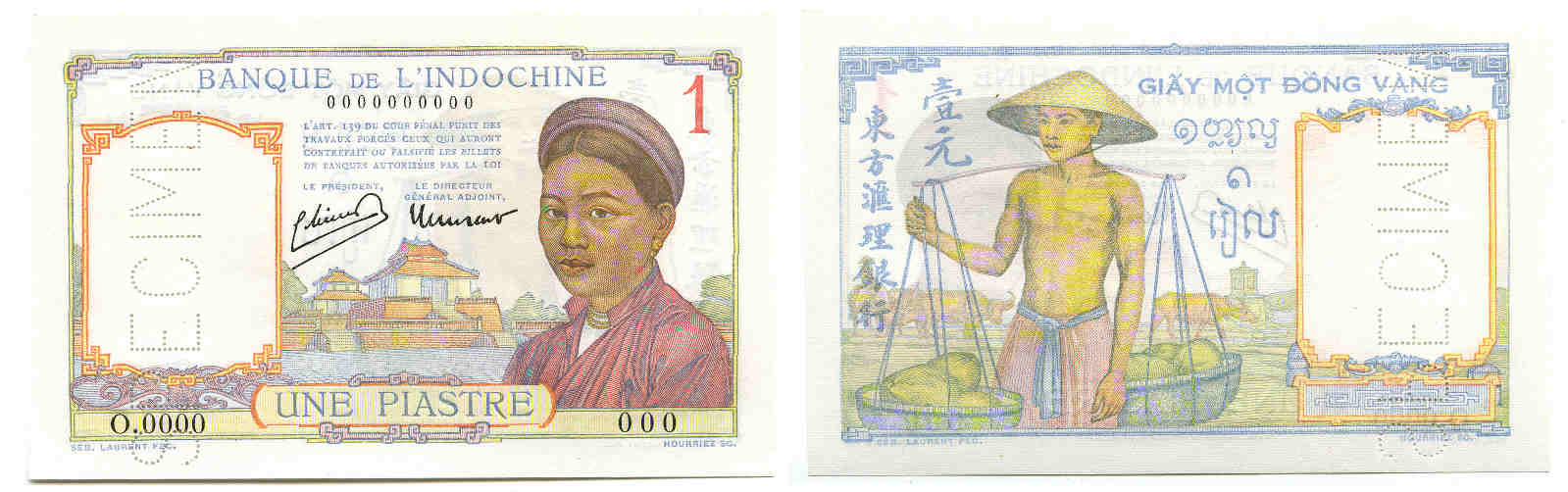Billet de 1 piastre – Giay mot dong vang – Banque de l’Indochine – Spécimen