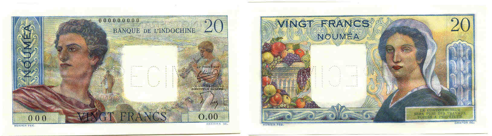 Billet de 20 francs – Nouméa – Banque de l’Indochine – Spécimen