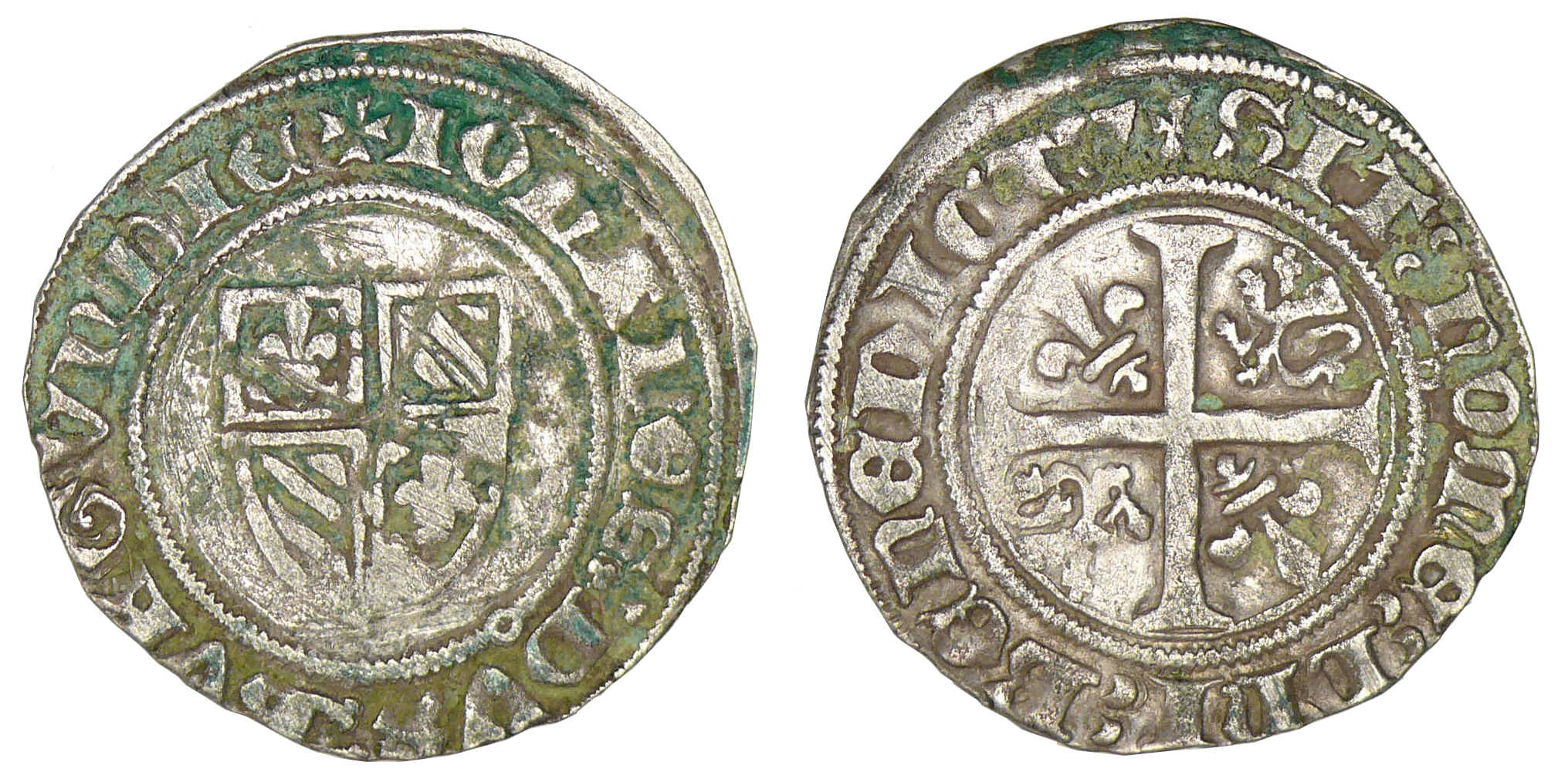 Avers : Jean sans peur (1404-1419). A/ IOHANES DVX BVRGVNDIE. Ecu écartelé de Bourgogne.