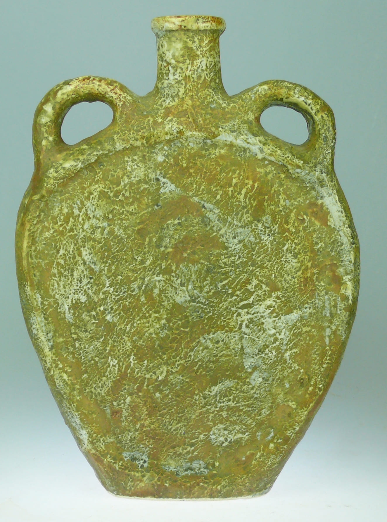 Avers : Bouteille amphore en céramique, à 2 petites anses arrondies, col court et bord plat, la panse ornée d’un décor émaillé représentant Ramsès debout dans un char tiré par un cheval avec couverture et plumet d’apparat. Un oiseau vole au dessus du char . Des frises très colorées au dessus et en dessous du char. Bouteille estampillée du logo de Borghini Lacrima Christi dans un cercle entouré de MADE ITALY. Exclusivity for BRESCIANI ARCO Gardasao hand painted. Manque le bouchon. 23 cm
