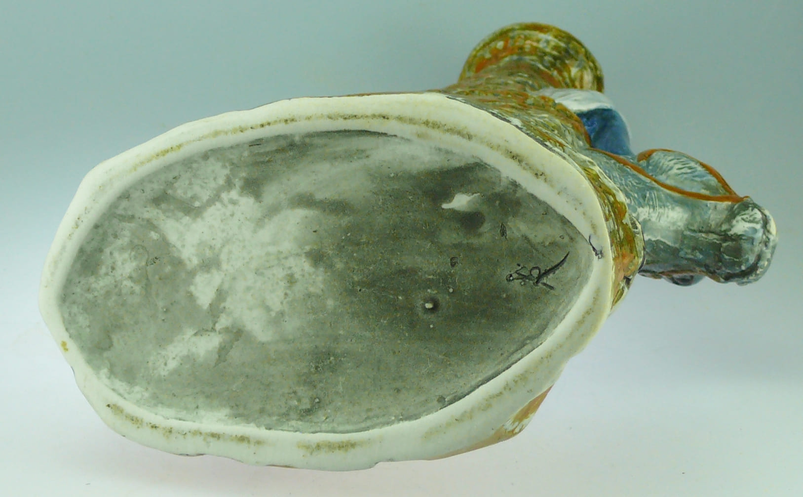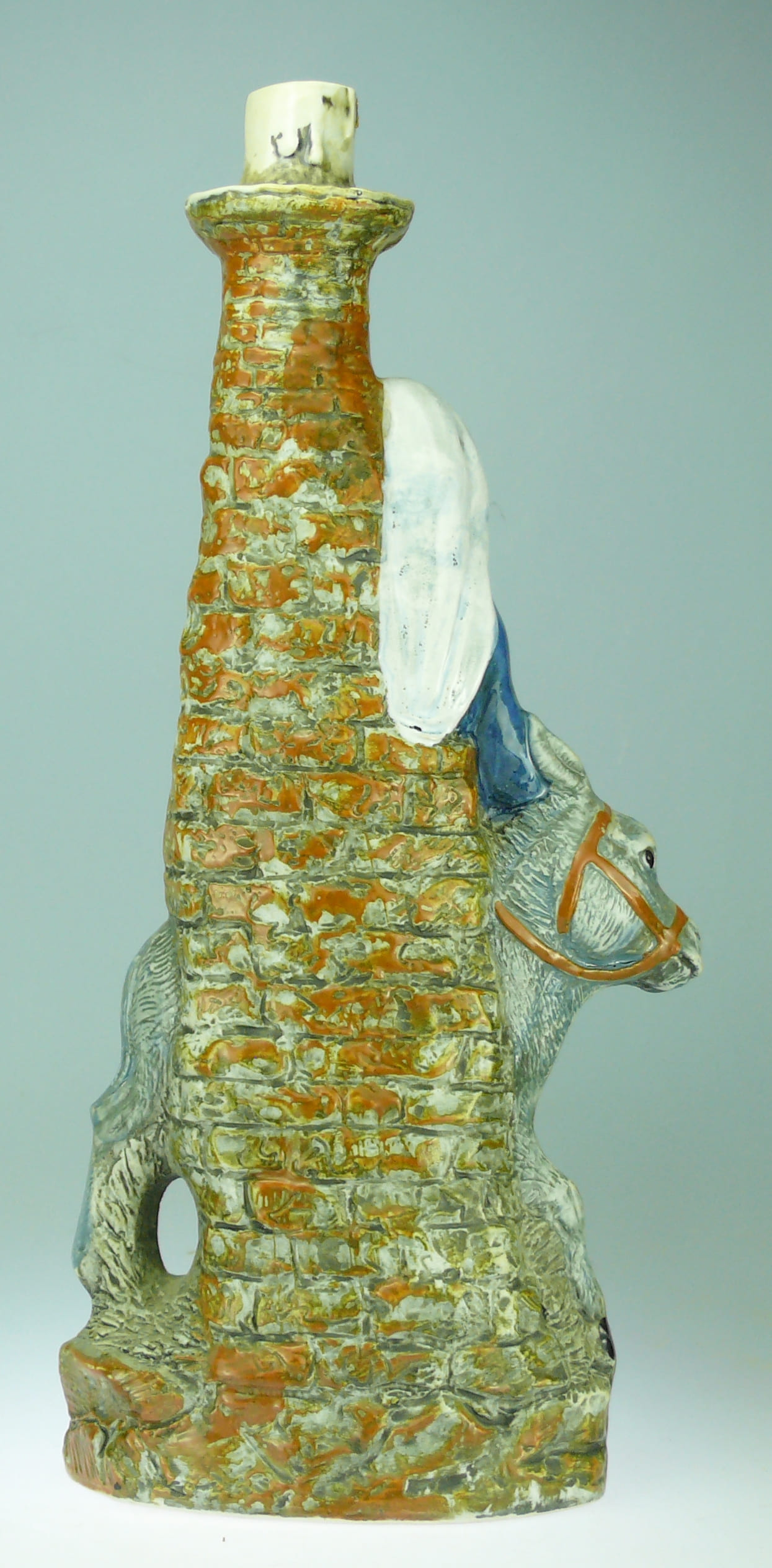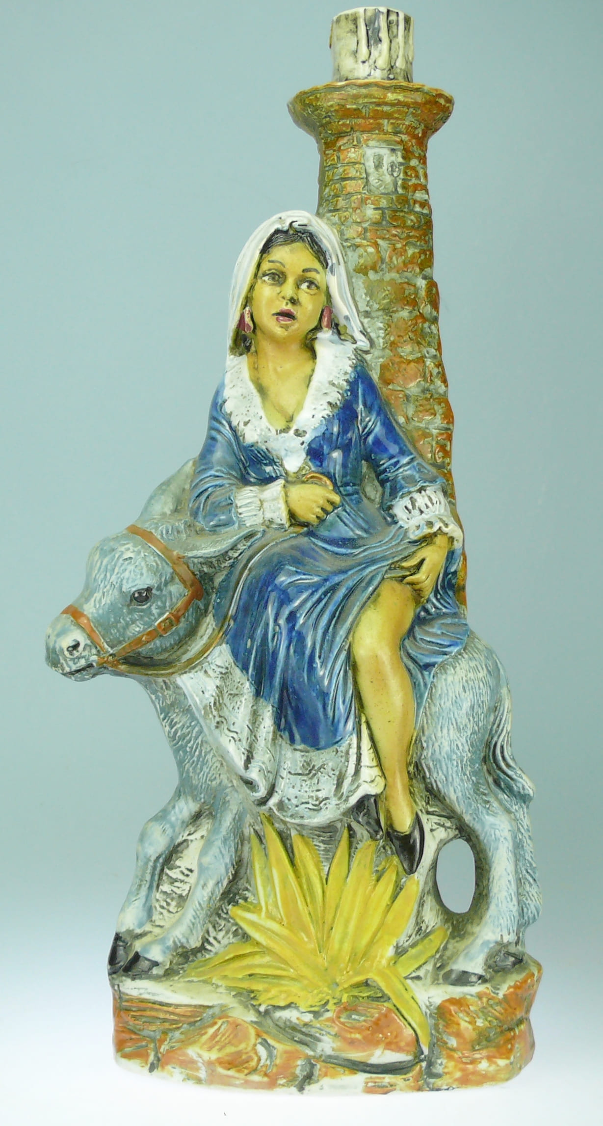 Avers : Bouteille en céramique émaillée représentant une demoiselle vêtue d’une longue robe bleue à large col blanc, à califourchon sur un âne gris, la jambe gauche dénudée. Un décor de tour en pierres derrière et de grandes feuilles en dessous du personnage. Manque le bouchon. 35 cm