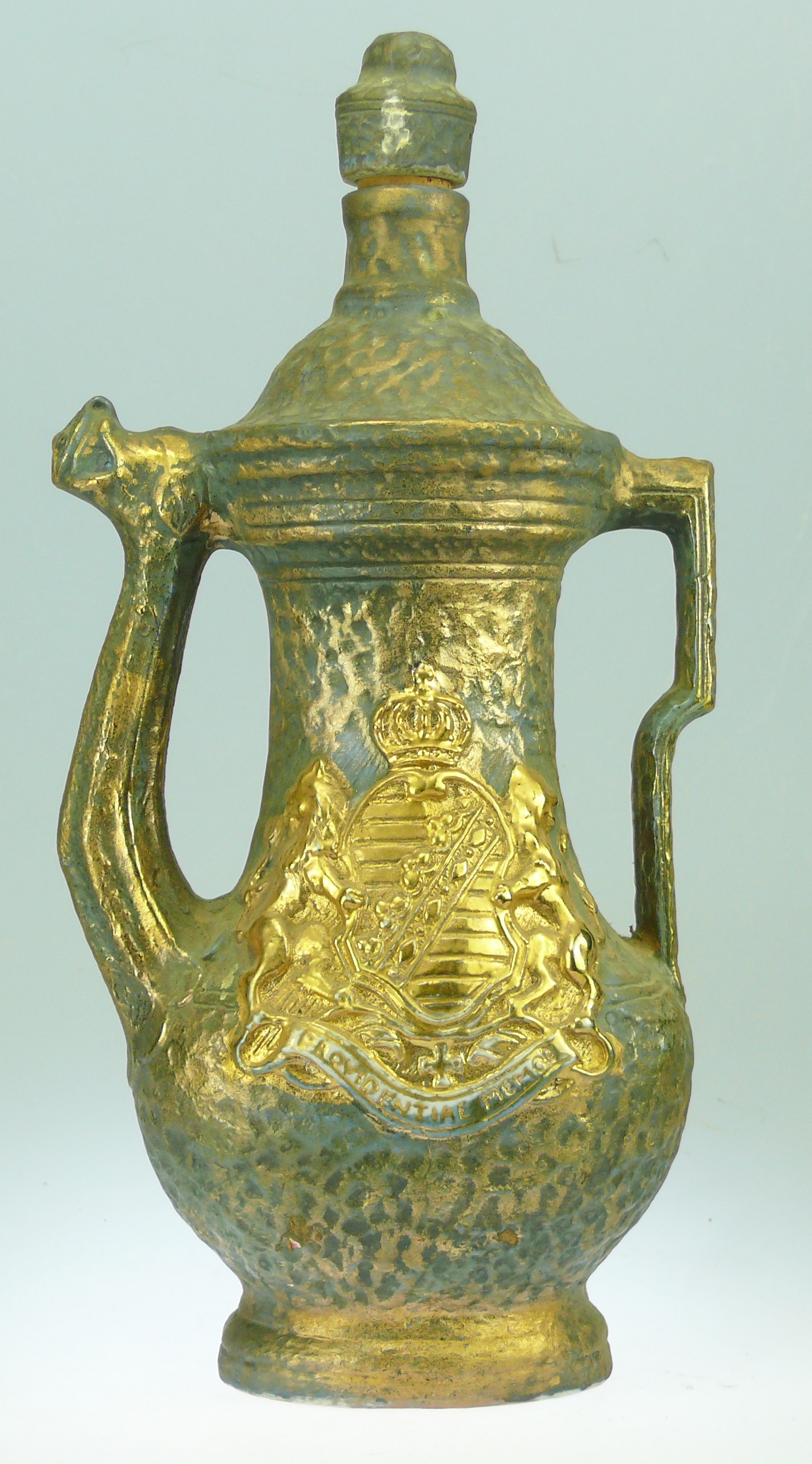 Avers : Bouteille en céramique à décors émaillés dorés, représentant une cafetière à col court, à anse à angle droit et le long bec verseur se terminant par une tête d’animal. La panse est ornée par la représentation d’un blason tenu par des lions debouts, le tout doré, une banderole inscrite en latin en dessous. La bouteille a encore son bouchon d’origine. Bouteille estampillée en dessous du logo de Borghini Lacrima Christi dans un cercle, MADE IN ITALY en dessous. 29 cm.
