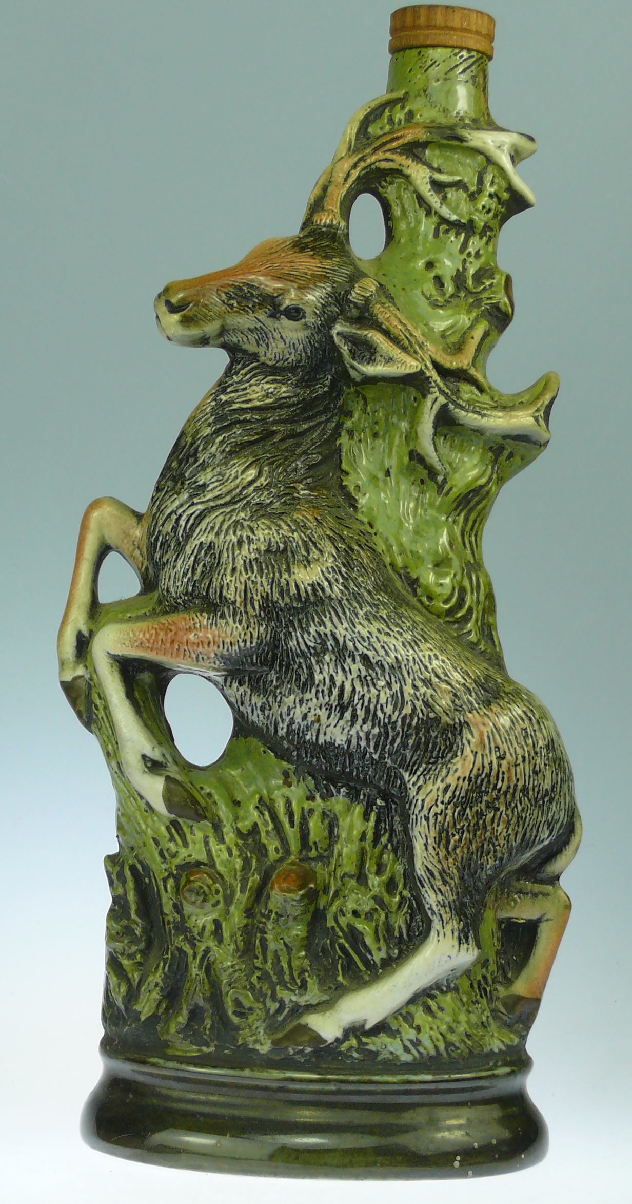 Avers : Bouteille en céramique émaillée représentant un grand cerf cabré sur les pattes arrières. Bouteille reposant sur une base ovale estampillée en dessous du logo de Borghini Lacrima Christi dans un cercle, accosté d’un C dans un cercle et de la date 1978 ; le tout entouré de la mention HAND PAINTED – MADE ITALY. 31 cm.