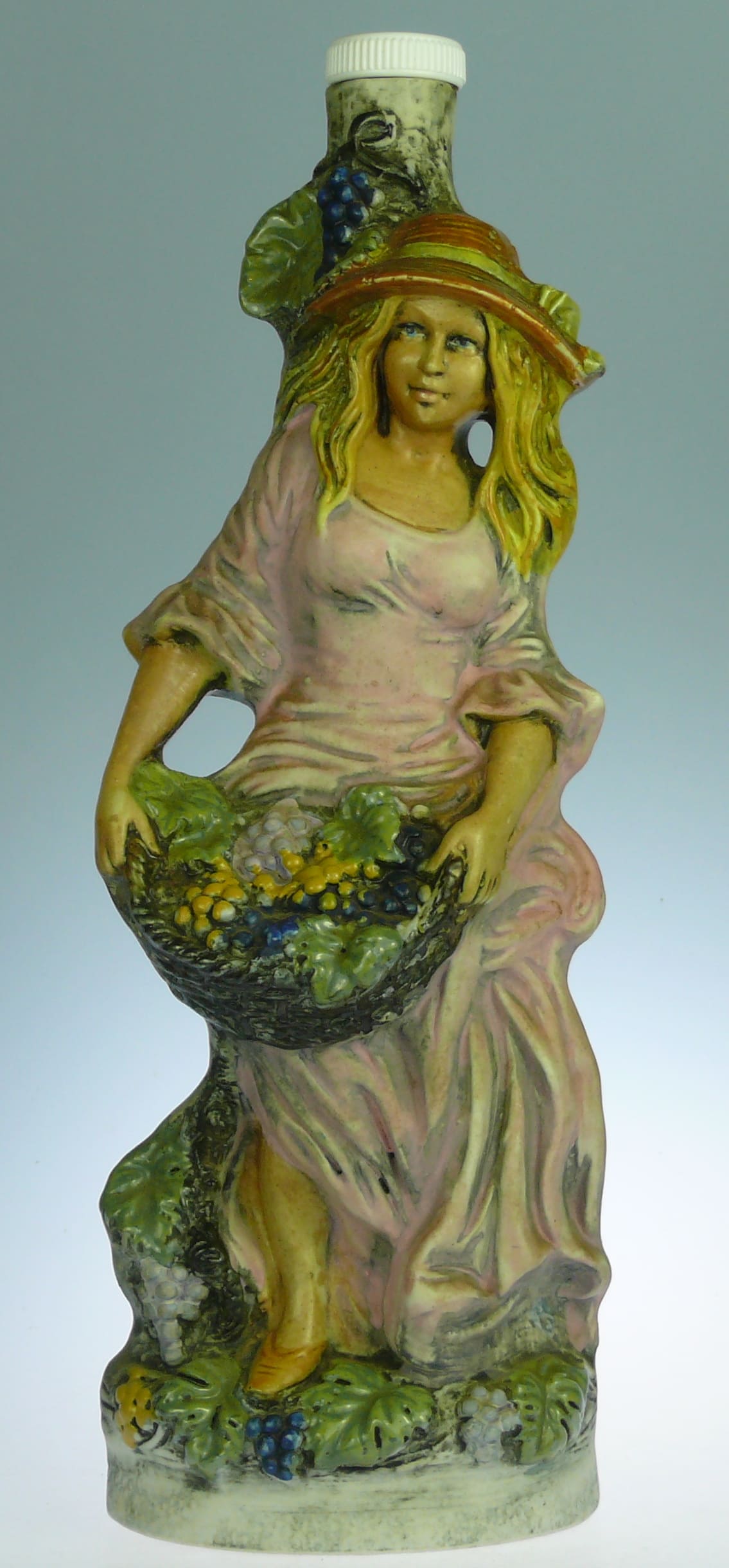 Avers : Jolie bouteille en céramique au décor émaillé représentant une jolie jeune fille à la longue chevelure blonde, coiffée d’un large chapeau orné d’un ruban jaune et vêtue d’une longue robe rose. La jeune fille se trouve dans un décor de vigne et porte un panier rempli de grappes de raisins. Bouteille avec son bouchon. La bouteille est estampillée au-dessous du logo de Borghini Lacrima Christi dans un cercle, accosté d’un C dans un cercle et de l’année 1977. Au-dessus la mention HAND PAINTET (pas PAINTED) et au-dessous MADE ITALY. 31 cm.