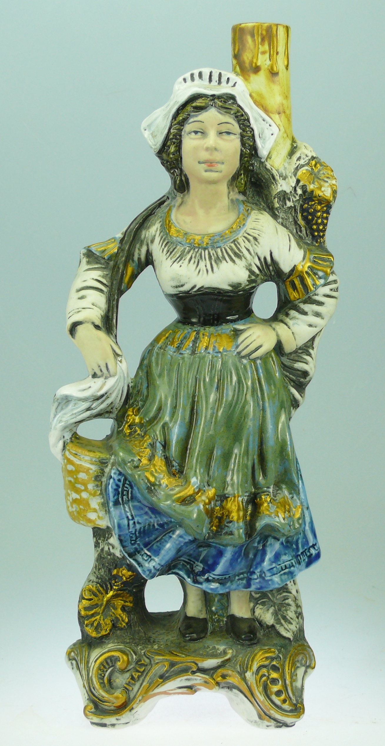 Avers : Bouteille en céramique émaillée représentant une jolie demoiselle vêtue d’un haut blanc à bords dorés, d’un tablier vert et doré posé sur une longue jupe bleue. Elle est coiffée d’un bonnet blanc et a un panierprès d’elle. L’ensemble repose sur une base ornée de feuilles et de rinceaux dorés. Bouteille estampillée en dessous du logo de Borghini Lacrima Christi dans un cercle, entouré des mentions HAND PAINTED et MADE ITALY, d’un C dans un cercle et de l’année 1979. 32 cm.