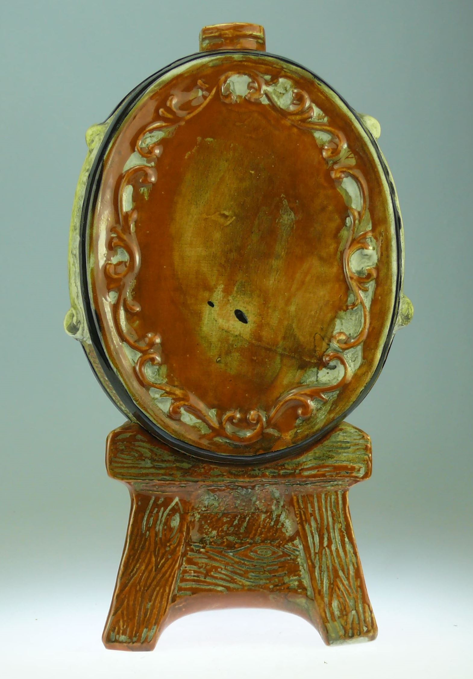 Avers : Imposante bouteille en céramique émaillée sans le bouchon, en forme de tonneau sur un socle. Le tonneau a son robinet et une façade joliment décorée d’une représentantion d’un homme et une femme assis dans une cave, autour d’un petit tonneau posé au sol. La bouteille porte le logo de Boghini Lacrima Christi dans un cercle. 30 cm