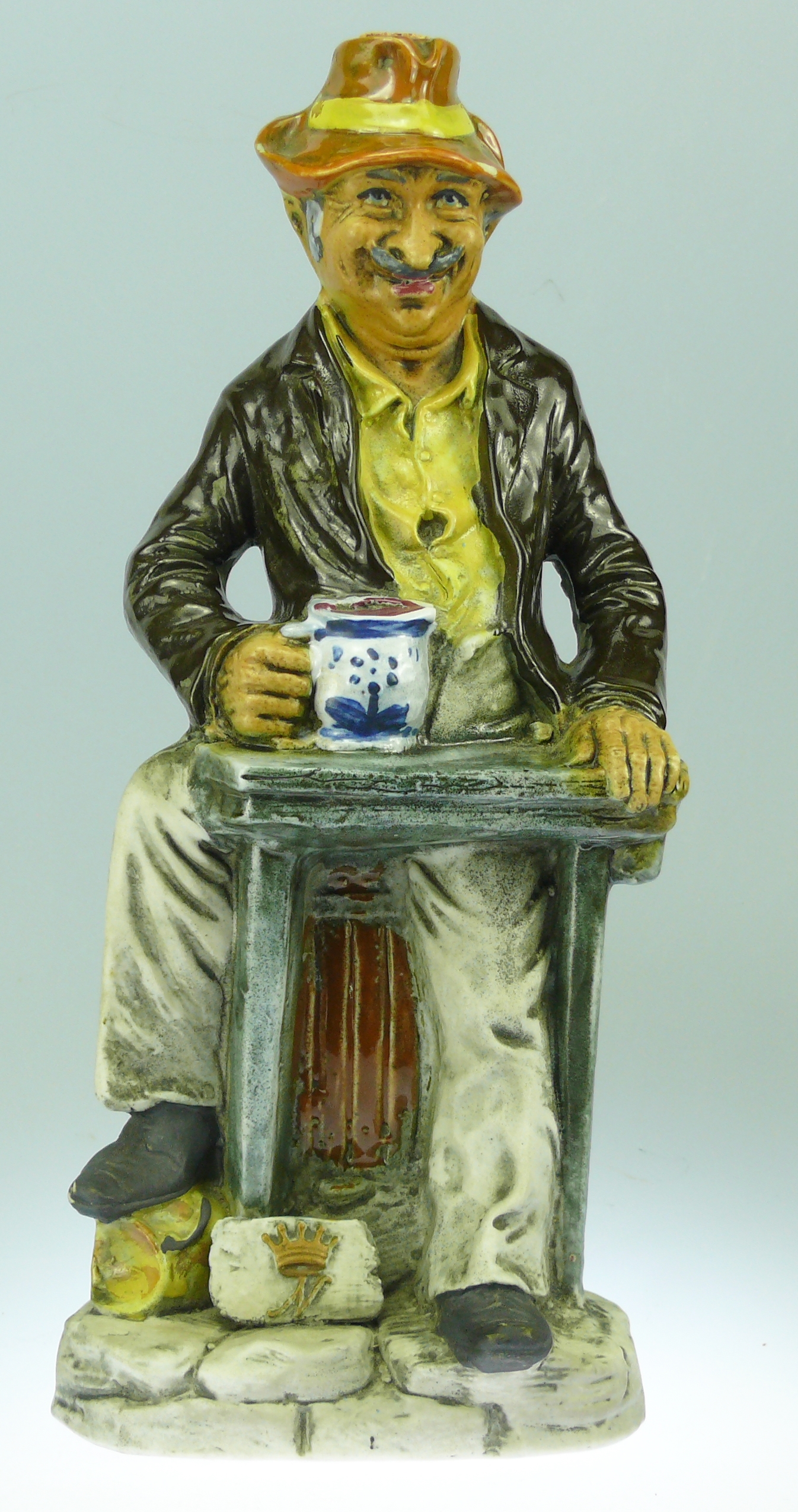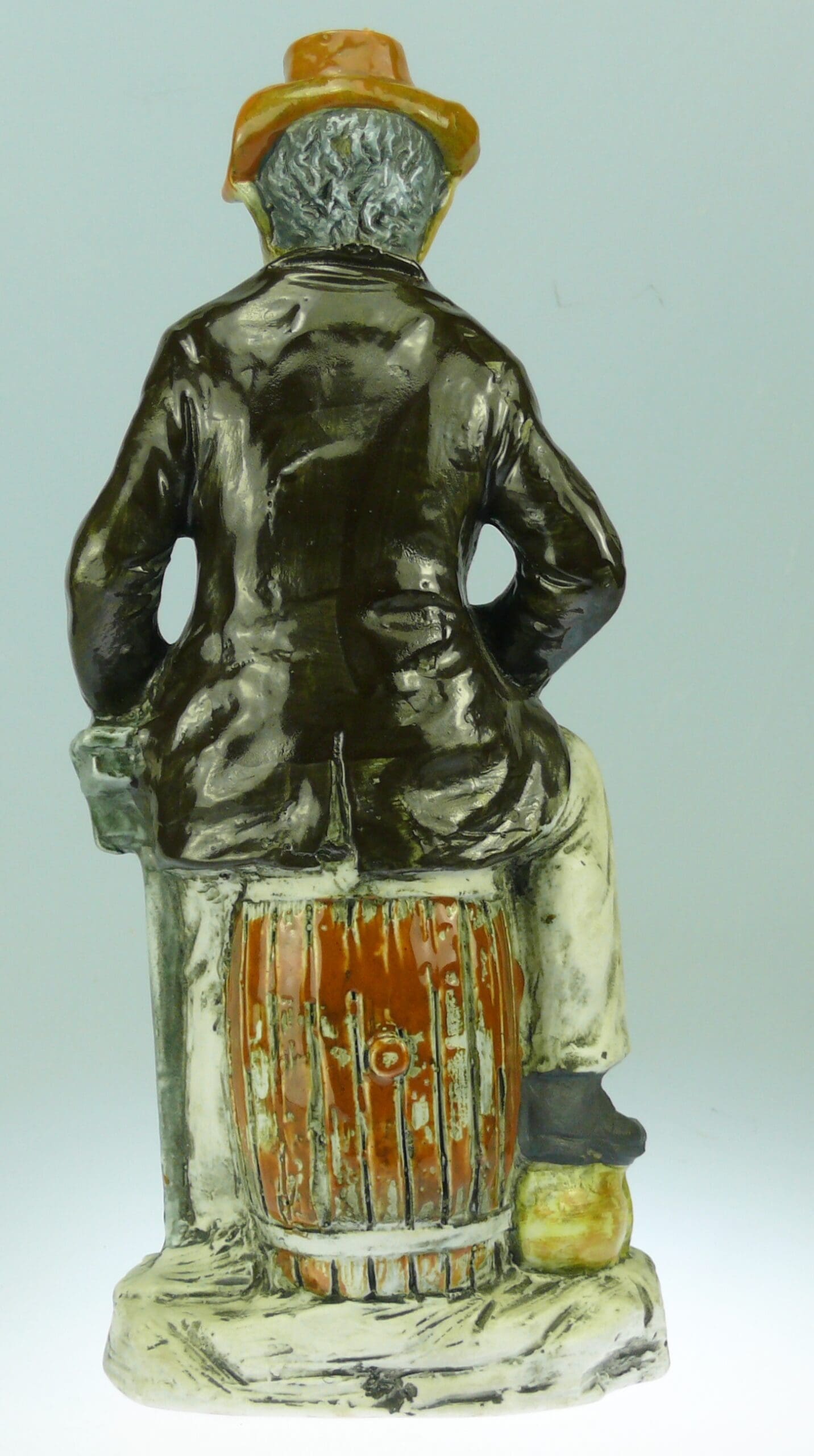 Avers : Bouteille en céramique émaillée représentant un vieillard souriant, coiffé d’un chapeau à bande jaune, assis à un comptoir sur un tonneau, un pied reposant sur une cruche au sol et tenant un pichet de vin dans la main droite. Au sol, une plaque avec la représentation d’un N couronné. Flacon estampillé au-dessous du logo de Borghini Lacrima Christi. 31 cm.
