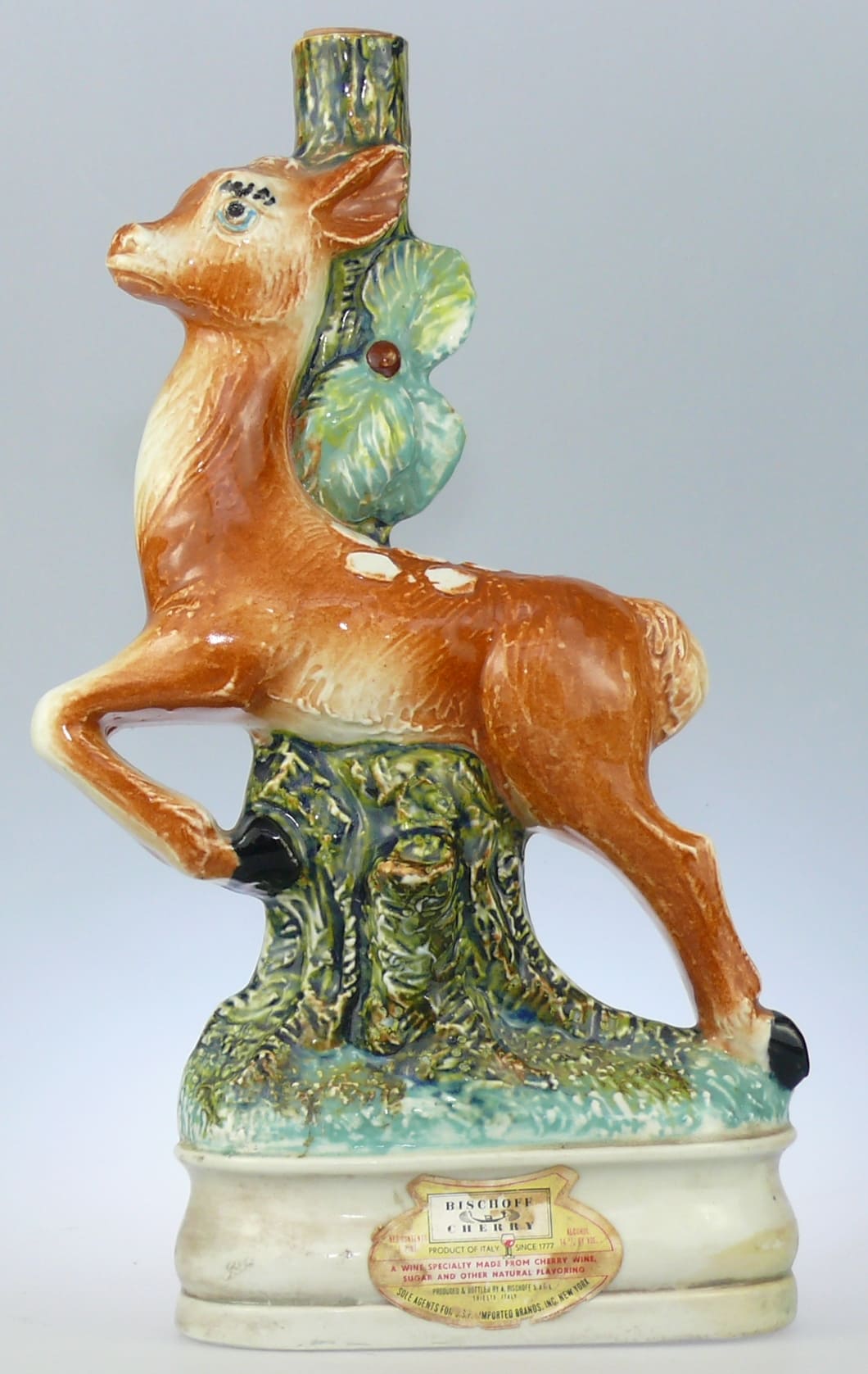 Bouteille à liqueur en céramique représentant un daim sautant au dessus d’une souche. La bouteille est encore scellé par son bouchon. La bouteille porte l’inscription : PRODUCEO AND HAND PAINTED IN ITALY. Dimensions : 29.8*15 cm