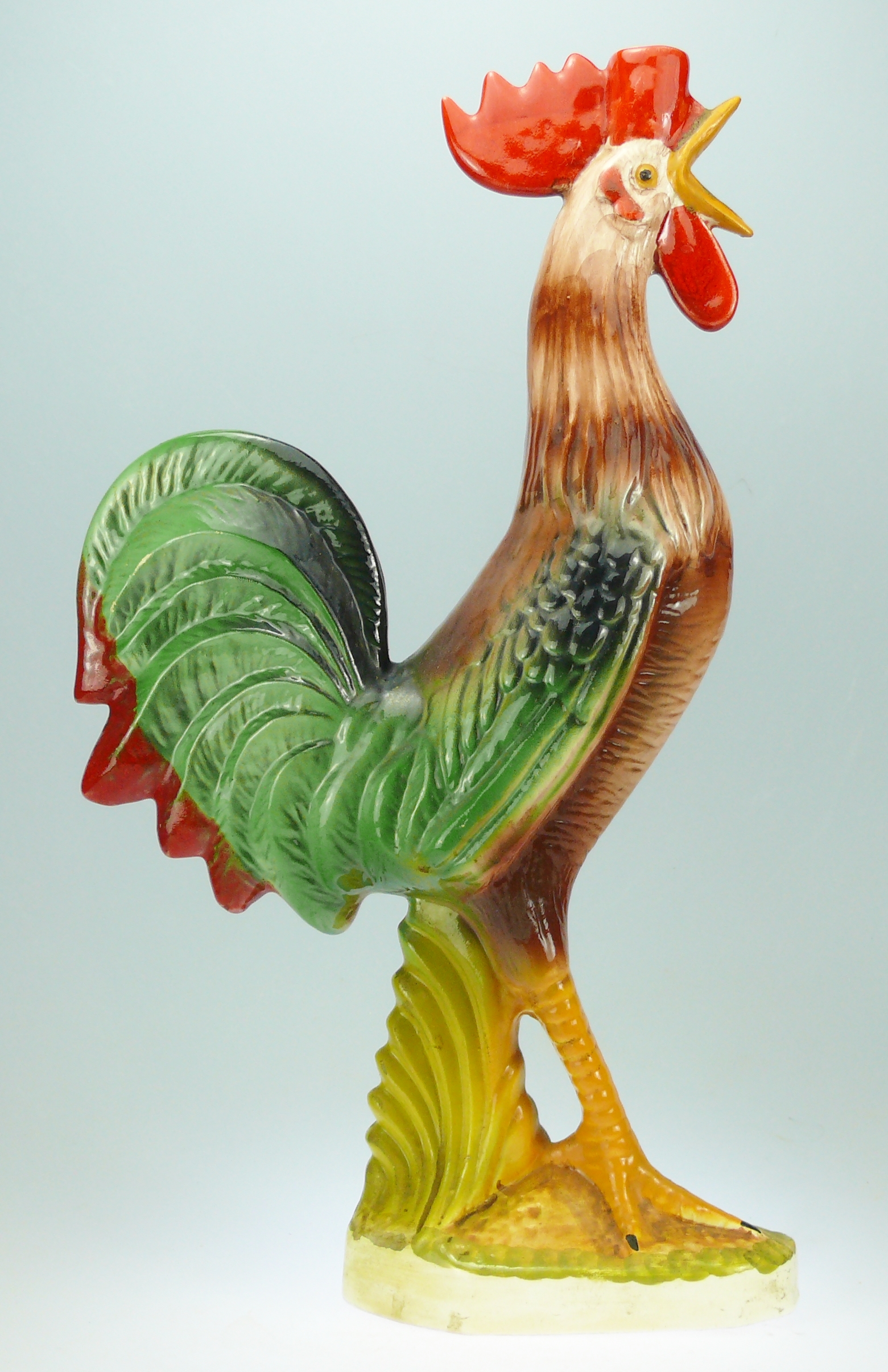 Avers : Bouteille en céramique émaillée représentant un coq aux couleurs flamboyantes en train de chanter. La bouteille a encore son bouchon d’origine. Les étiquettes ou inscriptions sous le socle ne sont plus là. Cette bouteille répertoriée sous le numéro KLEM-8004, page 339 de notre ouvrage : Catalogue Raisonné, « Les bouteilles Garnier Liqueurs », aux Editions : Monnaies d’Antan porte l’étiquette 1980 ou 1981 et existe en divers coloris. 37.5 cm