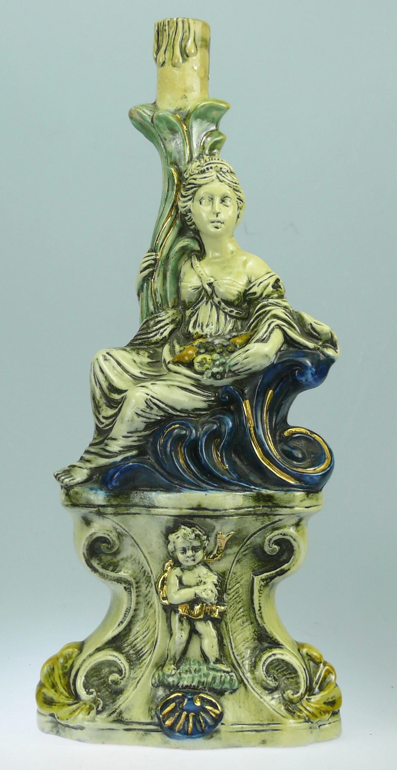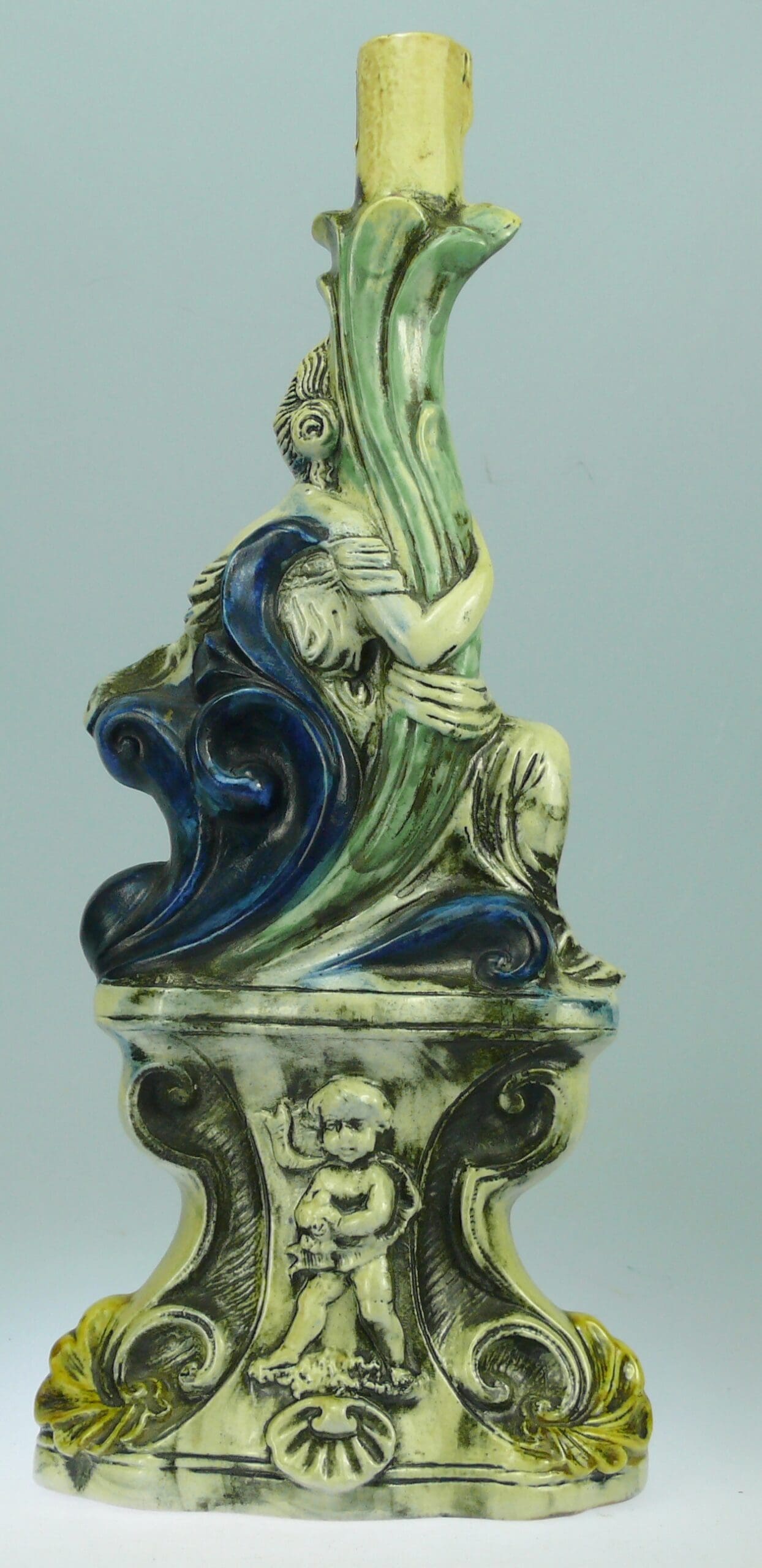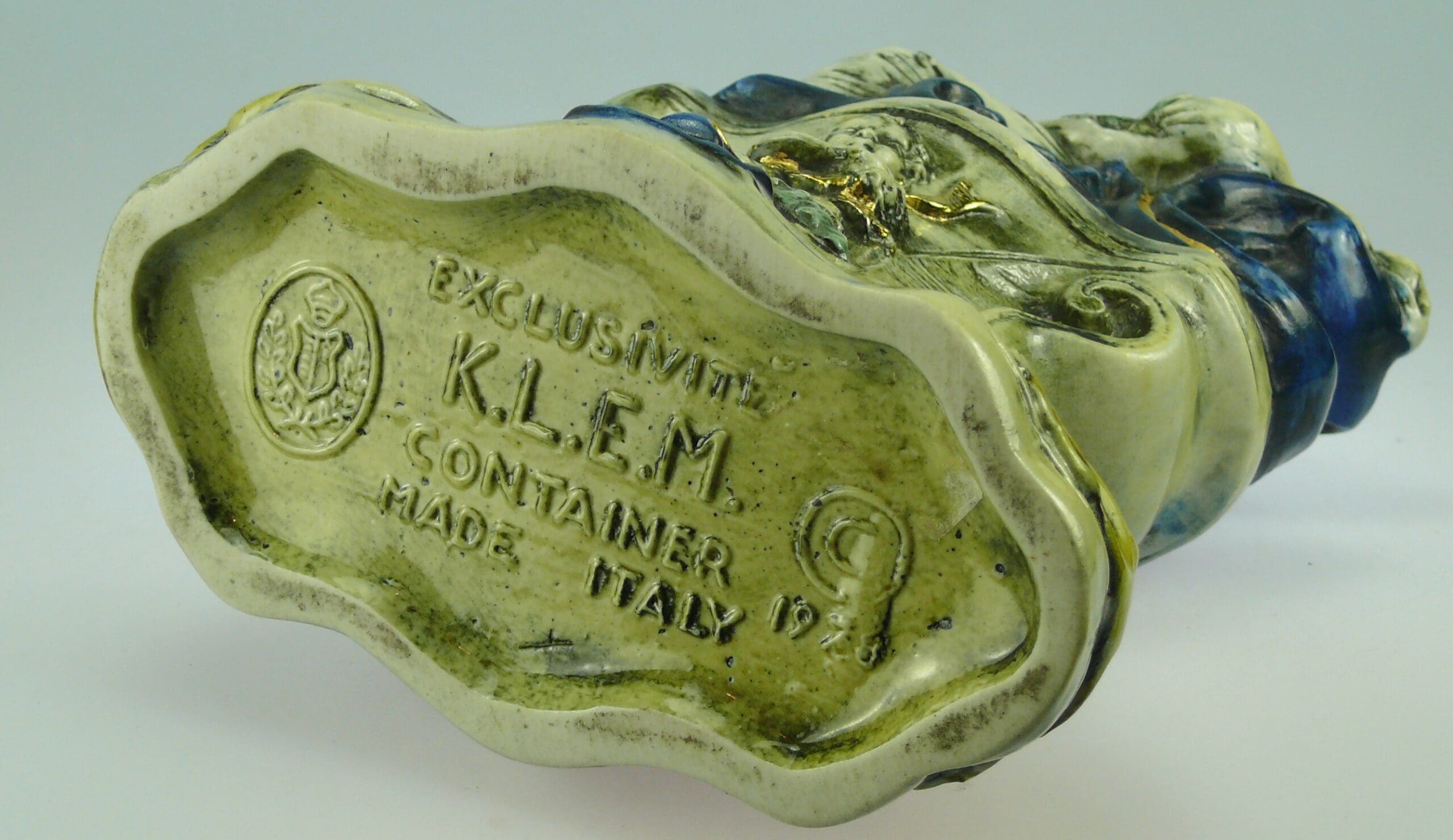 Avers : Bouteille bougeoir en céramique émaillée représentant une jeune femme vêtue à l’Antique, portant une corbeille de fruits. Le personnage est assis sur de grands volutes bleus posés sur une base ornée d’un chérubin. Manque le bouchon. Inscriptions sous le socle : EXCLUSIVITE K.L.E.M. – CONTAINER – MADE ITALY encadré de part et d’autre du logo de Borghini Lacrima Christi et de C dans un cercle et la date 1978 en dessous. Cette bouteille KLEM est répertoriée sous le numéro KLEM-7812 et se trouve à la page 330 de notre ouvrage Catalogue Raisonné, « Les bouteilles Garnier Liqueurs », aux Editions : Monnaies d’Antan. Manufacture de la bouteille Borghini Lacrima Christi. 33.5 cm