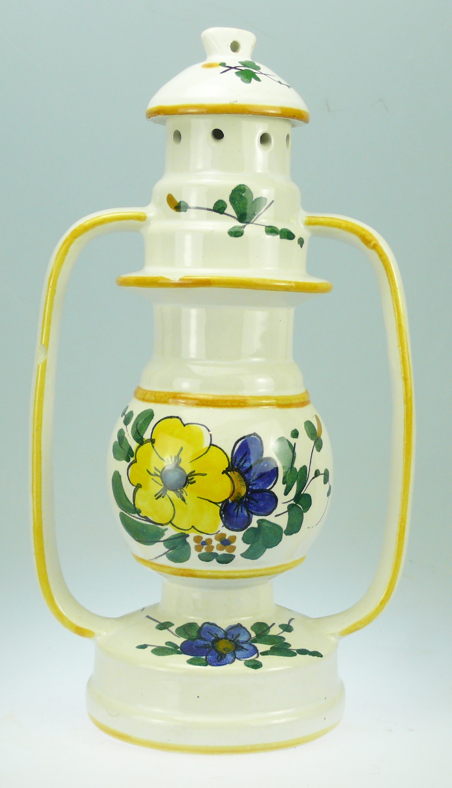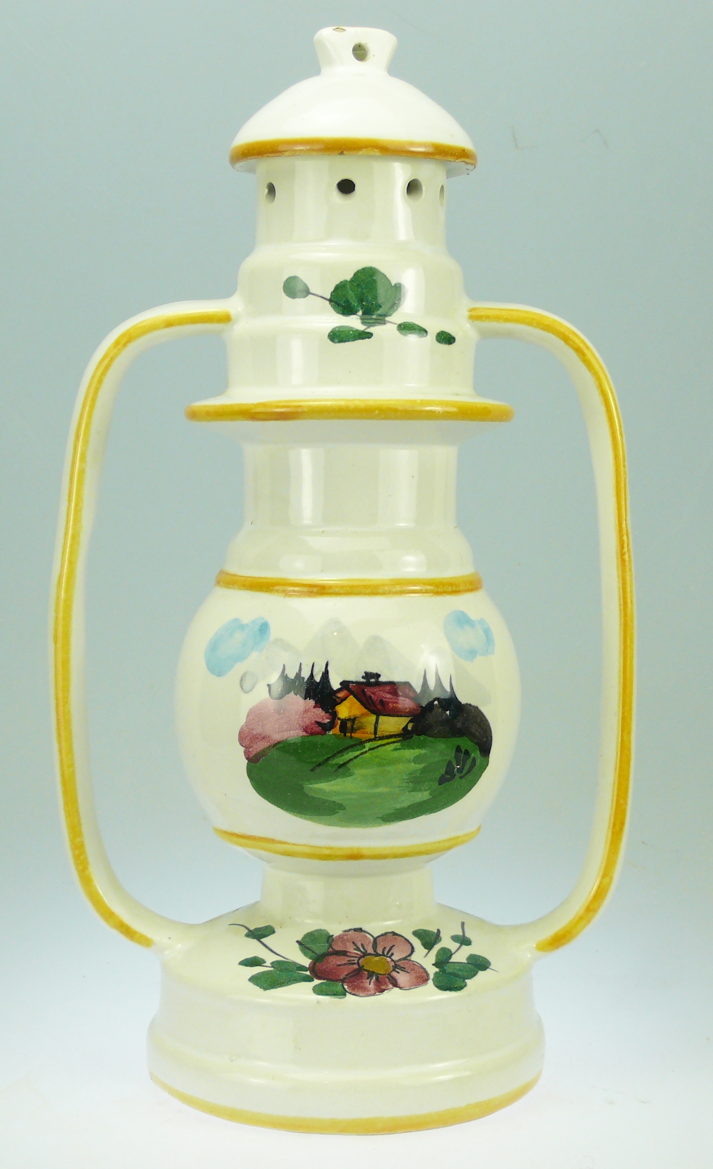 Avers : Bouteille en céramique émaillée de couleur blanche représentant une lanterne ornée de fleurs d’un côté de la panse et d’un paysage de montage à l’arrière. Liserés jaunes sur les contours. Petit éclat sur une anse et sur un bord du col. La bouteille a encore son bouchon d’origine en céramique. Les étiquettes ou inscriptions sous le socle ne sont plus là mis à part un tout petit fragment. Cette bouteille répertoriée sous le numéro KLEM-7804, page 327 de notre ouvrage : Catalogue Raisonné, « Les bouteilles Garnier Liqueurs », aux Editions : Monnaies d’Antan porte l’étiquette 1981 ou 1981 et existe avec des liserés marrons. 25 cm