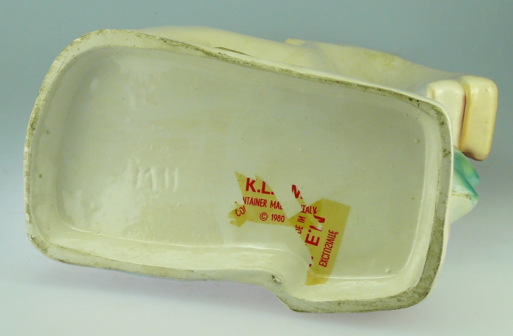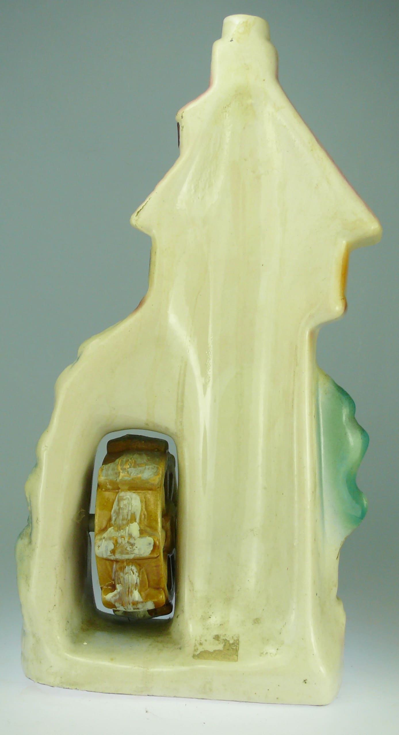 Avers : Bouteille en céramique émaillée représentant un moulin à eau très réaliste avec la roue à aube . Comporte encore une ancienne étiquette au niveau du goulot inscrite : ABRICOTINE 30°. Bouteille avec son ancienne étiquette en morceaux au dessous inscrite : EXCLUSIVITE – K.L.E.M. – CONTAINER MADE IN ITALY – 1980 (pouvait aussi avoir la date 1980). Cette bouteille KLEM est répertoriée sous le numéro KLEM-7807 et se trouve à la page 328 de notre ouvrage Catalogue Raisonné, « Les bouteilles Garnier Liqueurs », aux Editions : Monnaies d’Antan. Manque le bouchon. 35.5 cm