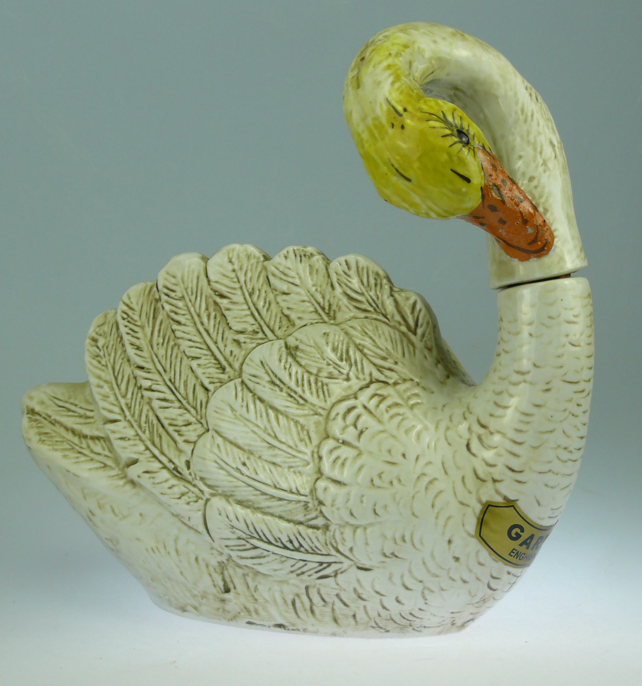 Avers : Très belle bouteille en céramqiue émaillée en forme de cygne, le cou replié, se nettoyant les plumes avec le bec. Etiquette récente Garnier, probablement collée tardivement sur une bouteille dont la provenance Garnier n’est pas certifiée. Par contre, présence d’une étiquette ancienne inscrite CURACAO – TRIPLE SEC D° 40 – S.A FRAMBOISE VEY MAURIN 43 ESPALY. La partie supérieure fait office de bouchon. Bouteille estamipllée en dessous du logo de Borghini Lacrima Christi dans un cercle et des inscriptions HAND PAINTED et MADE ITALY. 19*20.5 cm