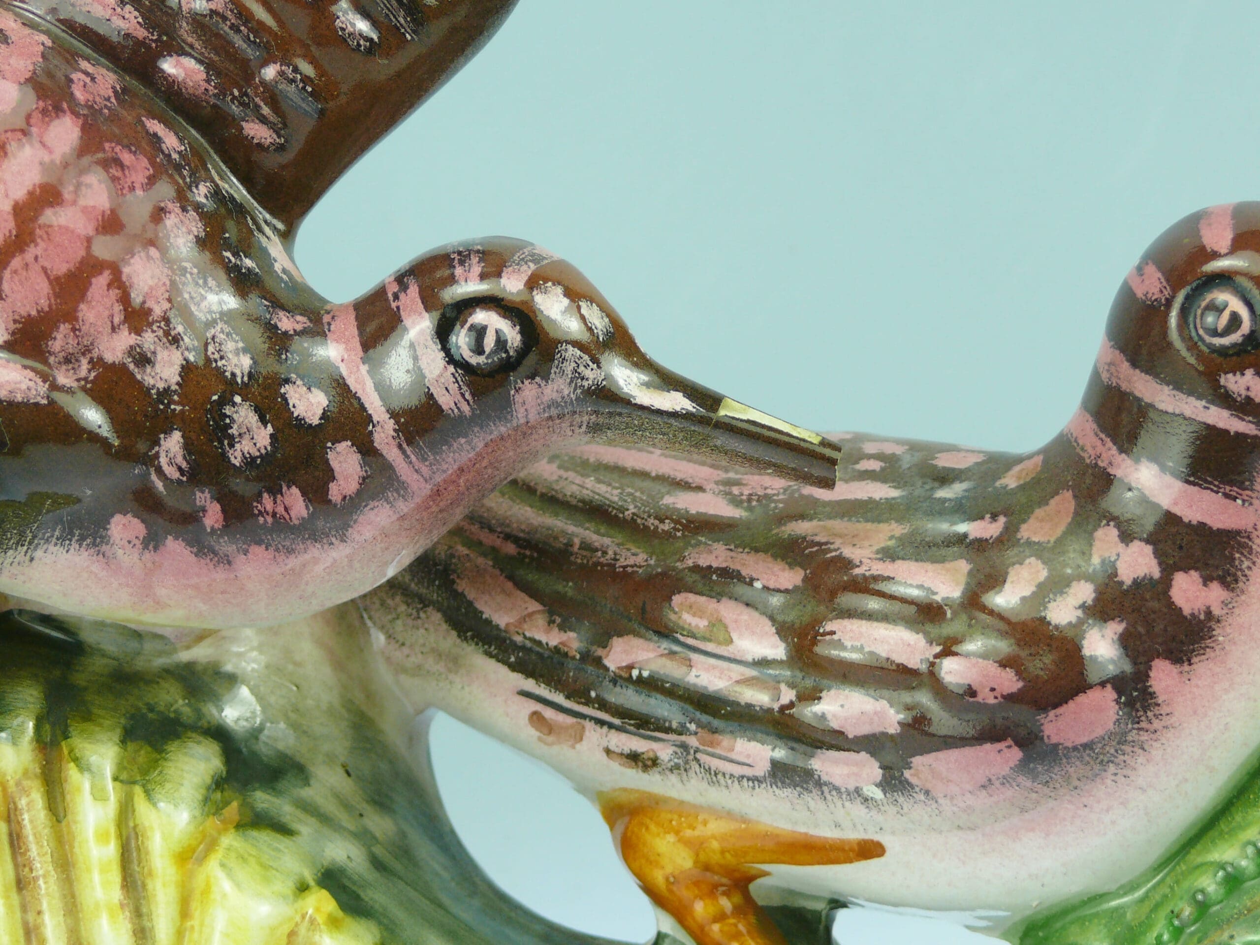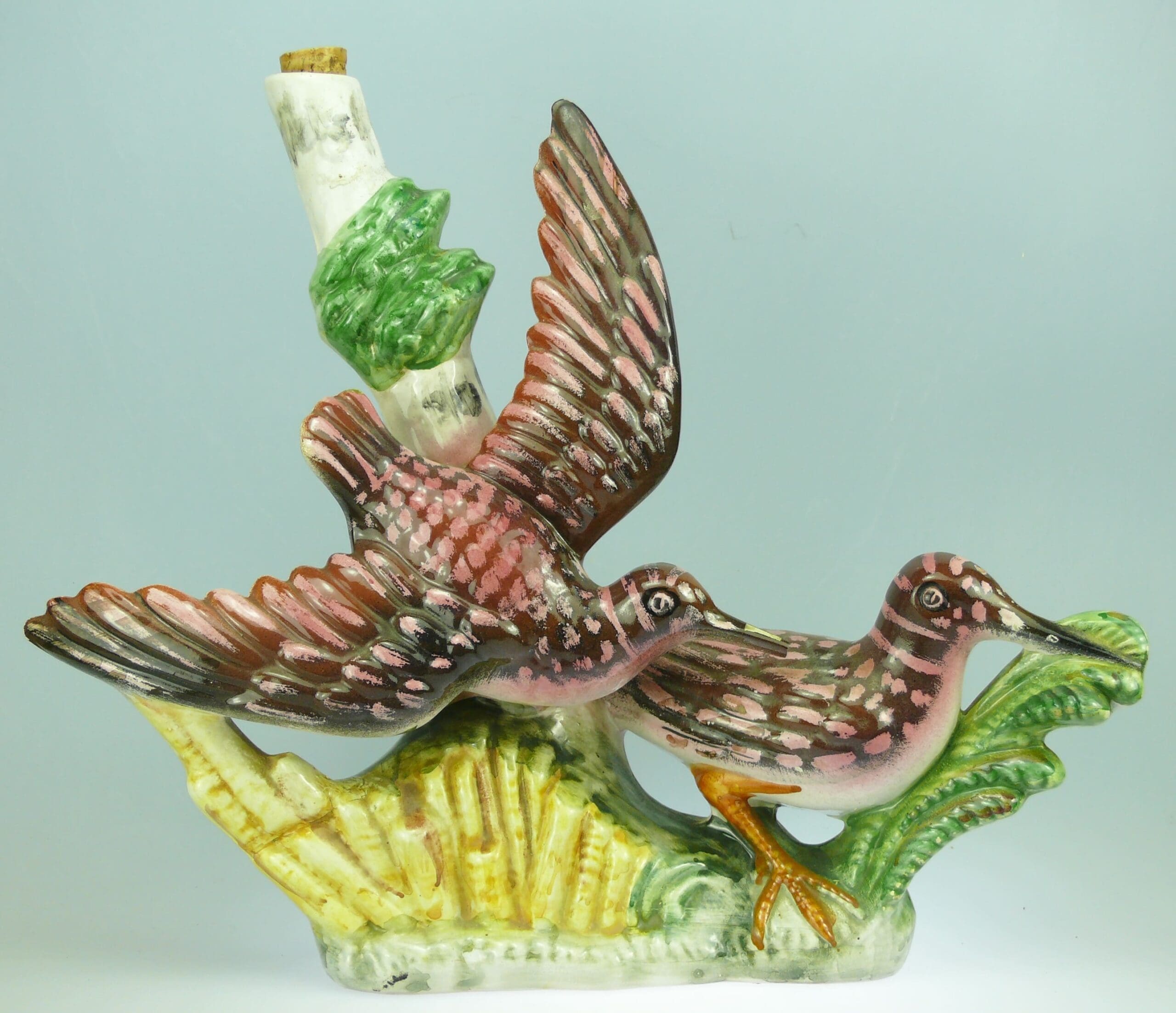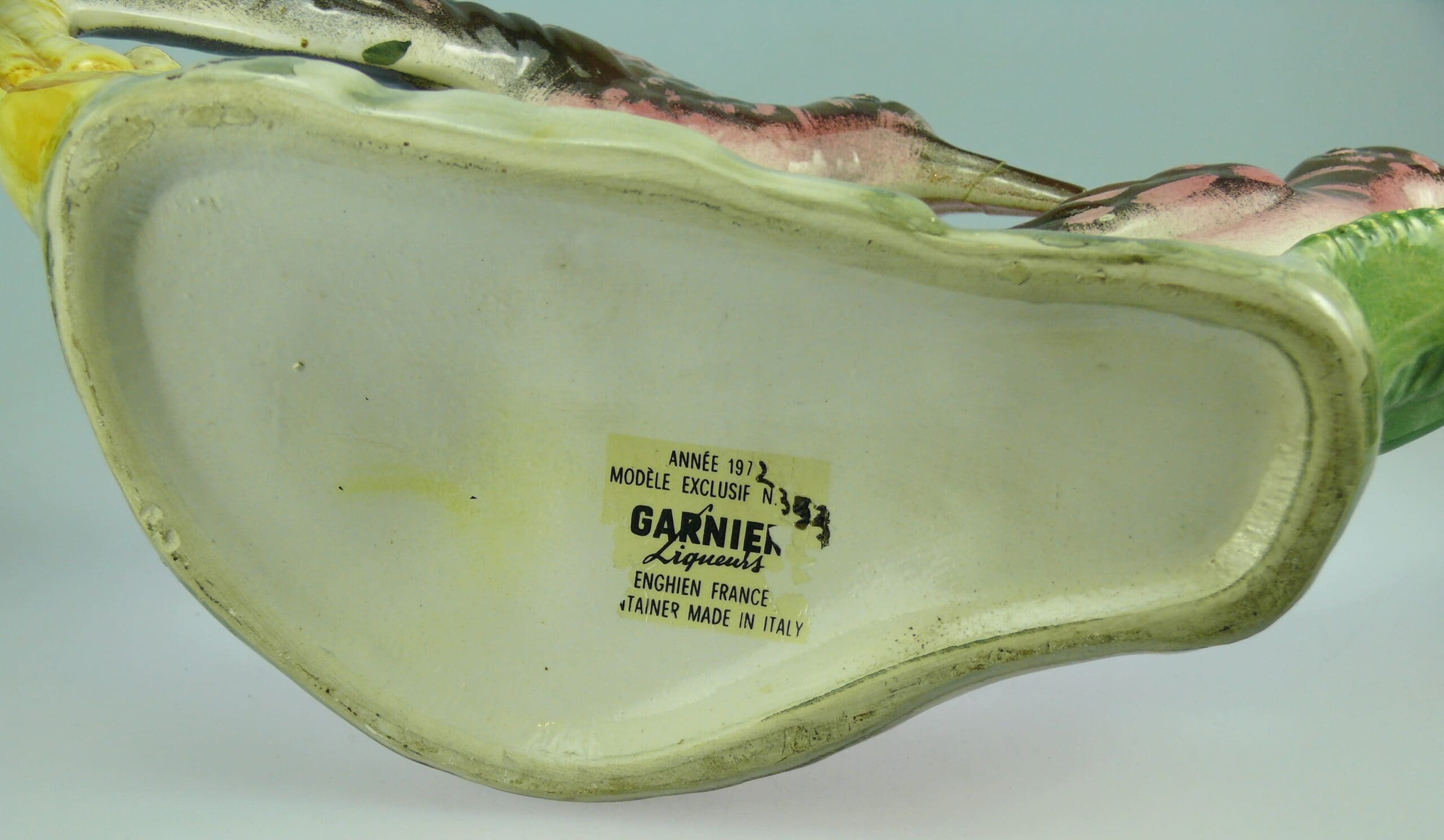 Avers : Bouteille en céramique émaillée représentant un couple de bécasses dans l’herbe. Bouteille avec son bouchon de liège. A noter une restauration par collage sur le bec d’un oiseau ainsi que le manque de l’extrémité du bec. Bouteille inscrite au dessous : ANNEE 1972 – MODELE EXCLUSIF N° 353 – GARNIER Liqueurs – ENGHIEN FRANCE – CONTAINER MADE IN ITALY. Bouteille répertoriée sous le numéro 353 et se trouve à la page 265 de notre ouvrage Catalogue Raisonné, « Les bouteilles Garnier Liqueurs », aux Editions : Monnaies d’Antan. 32 cm